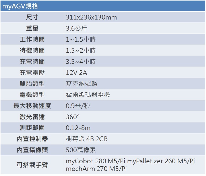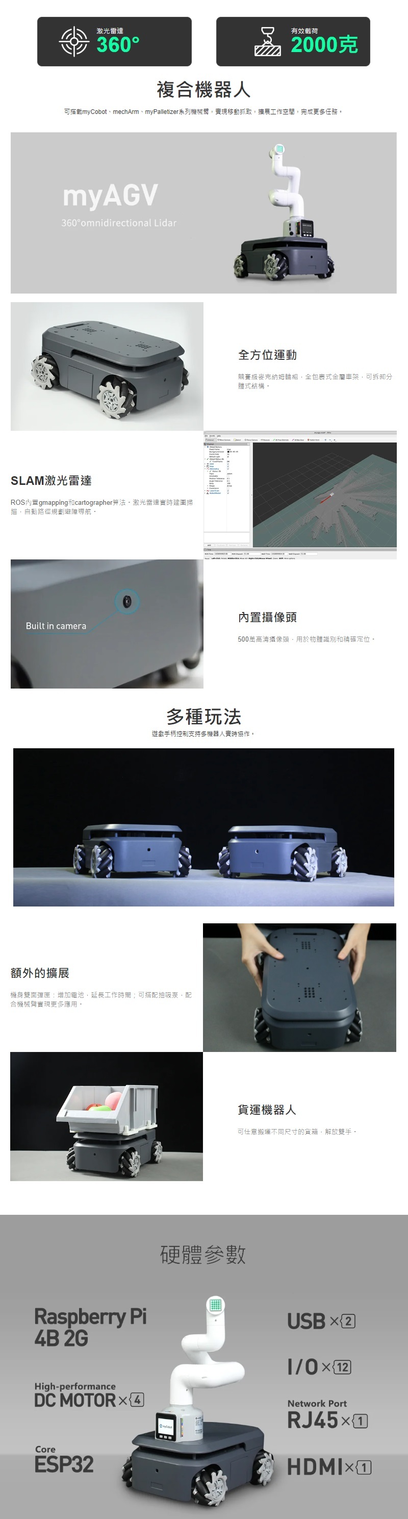 myAGV是一款優秀的複合式機器人,可用myCobot、mechArm等各式六軸協作型手臂整合應用。