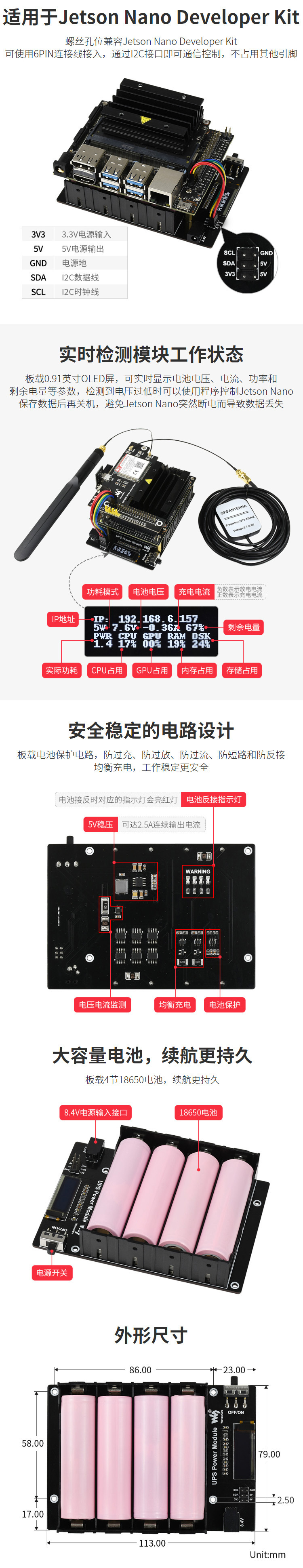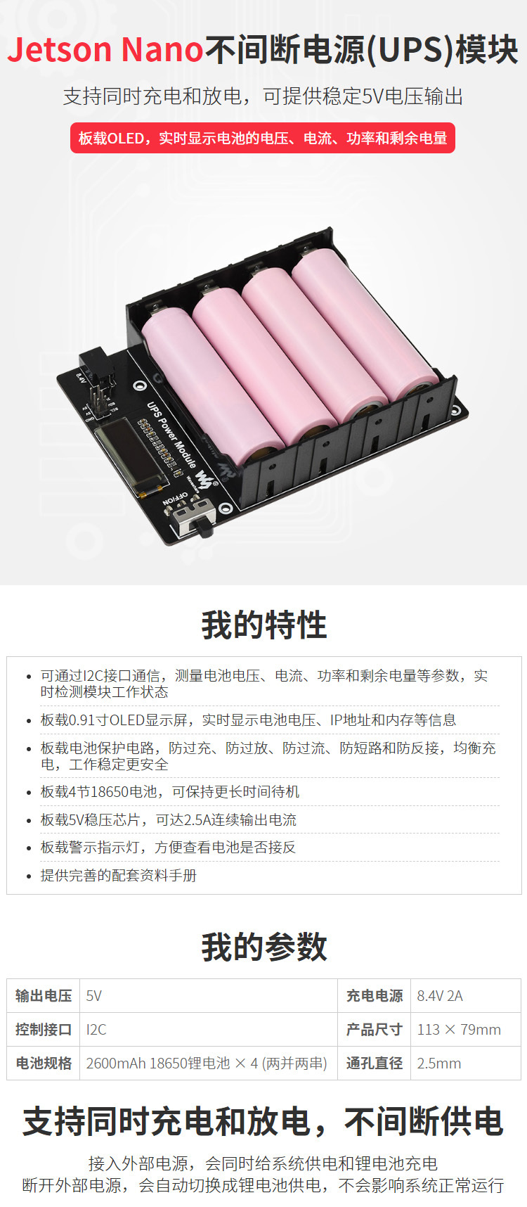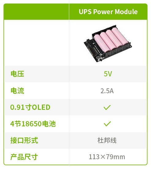 【產品規格】適用於jetson nano的不斷電供應系統(UPS)模組,支援同時充電和放電,可提供穩定5V電壓輸出,內建OLED可以實現顯示IP位址、電池的電壓、電流、功率等參數。