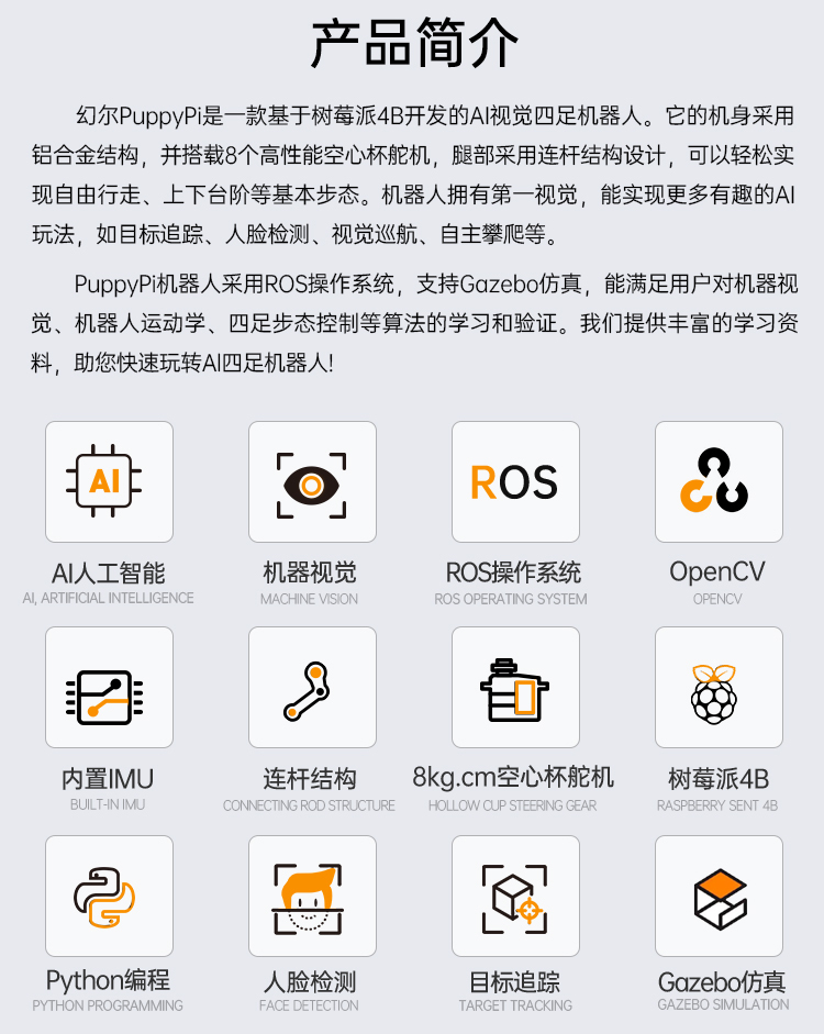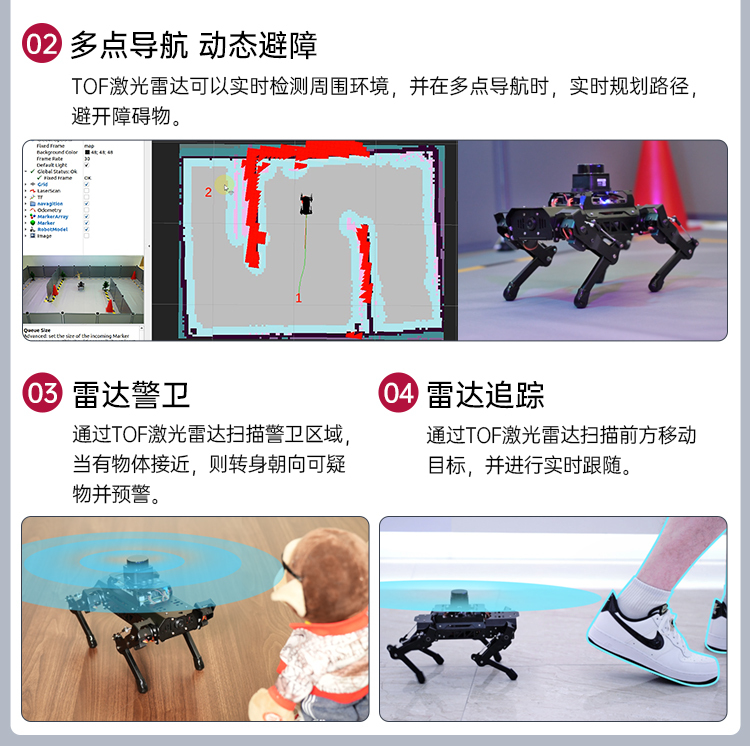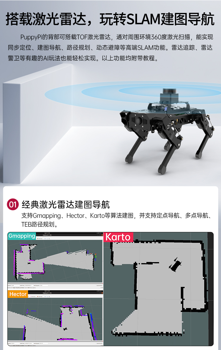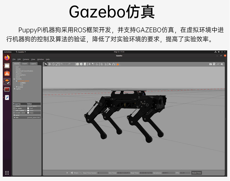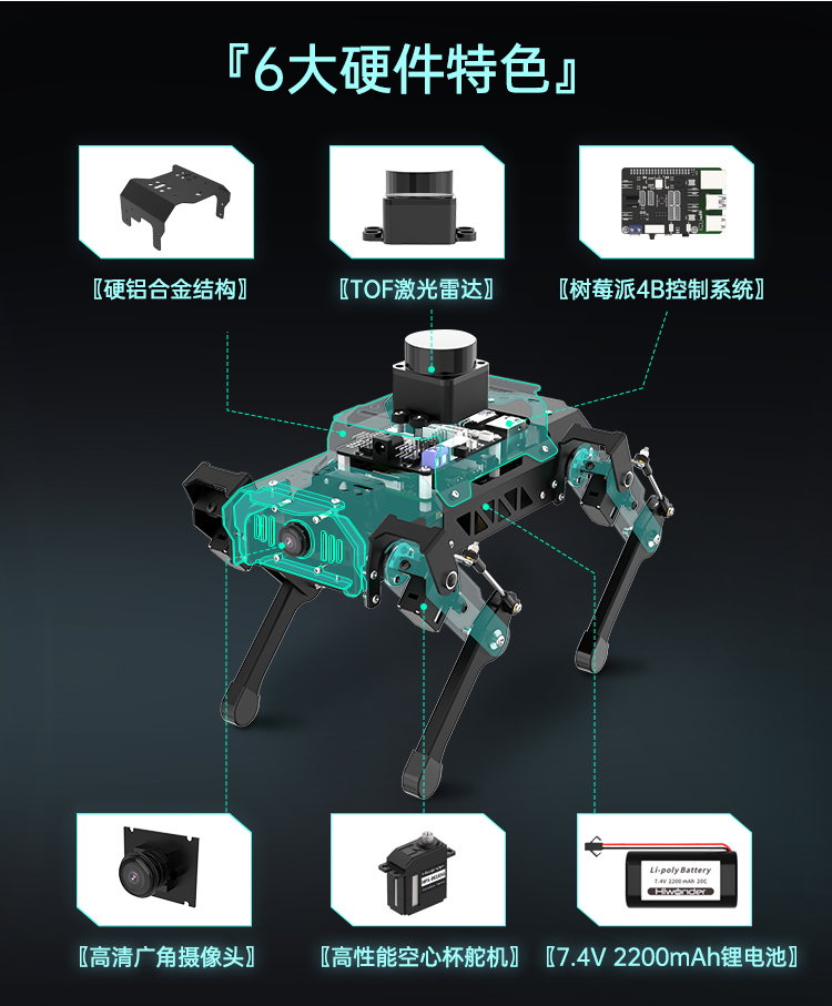 機器狗採用ROS作業系統,支援Gazebo模擬能滿足用戶對機器視覺、機器人運動學、四足步態控制等演算法的學習和驗證。