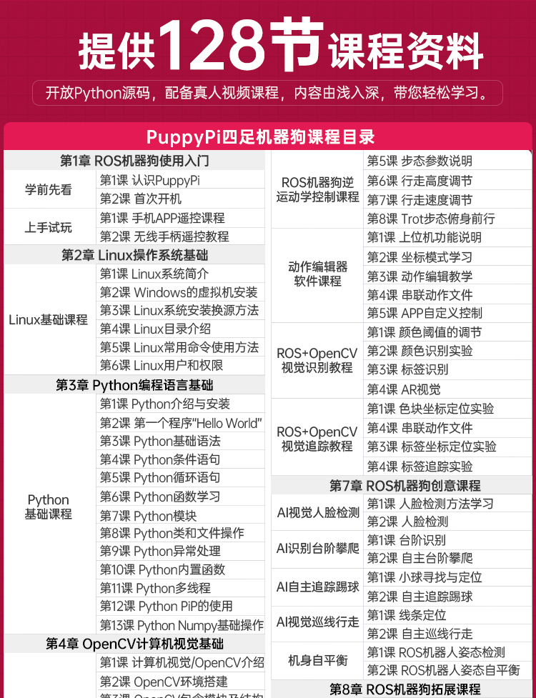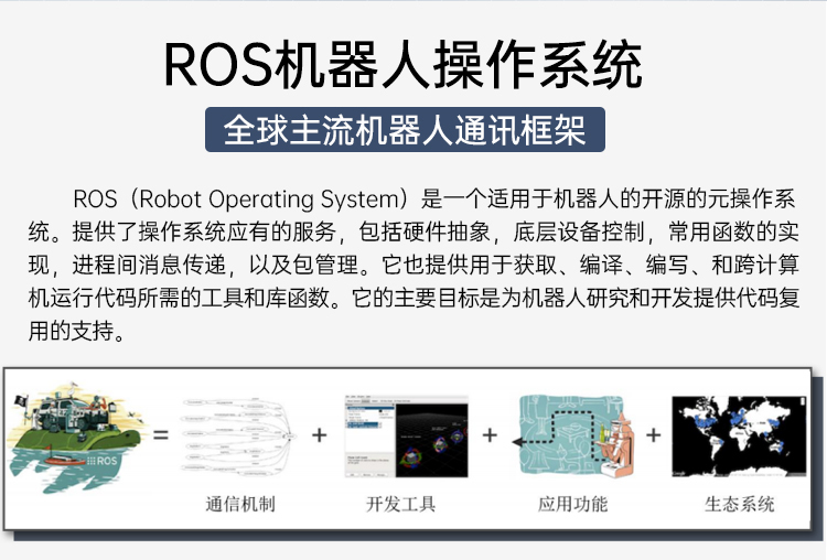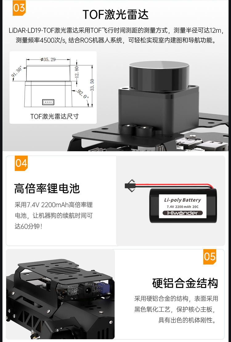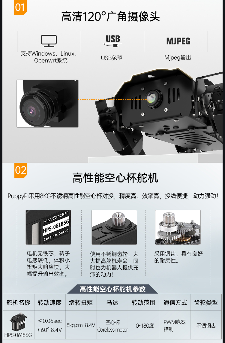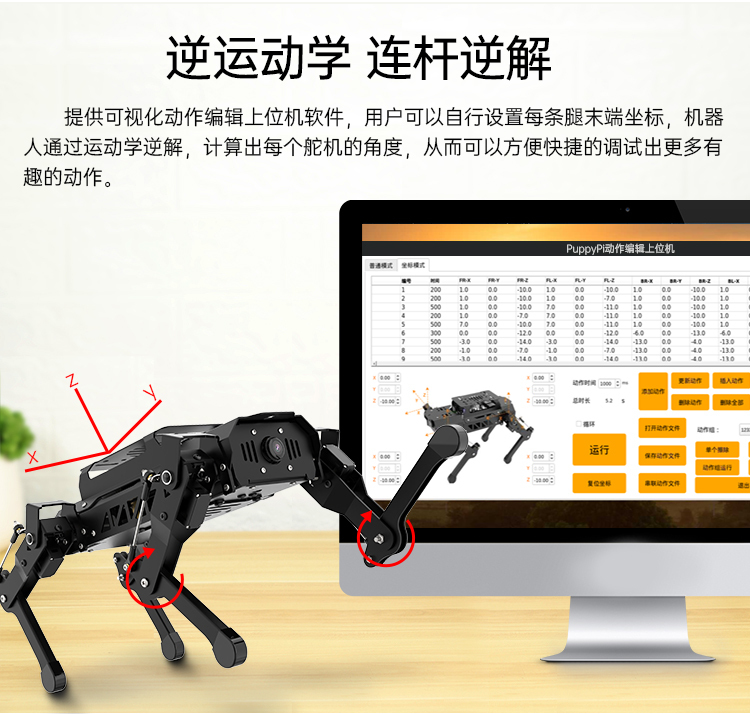 機器狗採用ROS作業系統,支援Gazebo模擬能滿足用戶對機器視覺、機器人運動學、四足步態控制等演算法的學習和驗證。