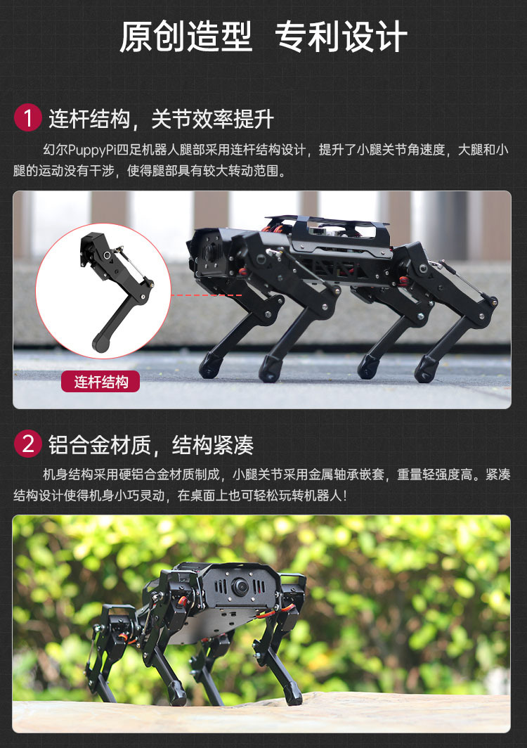 機器狗採用全鋁合金機身結構並搭載8個高性能伺服馬達,腿部採用連桿結構設計,可以輕鬆實現自由行走、上下臺階等基本步態。