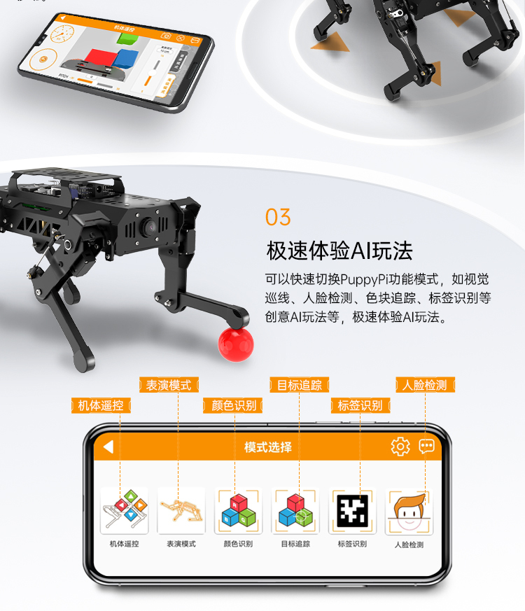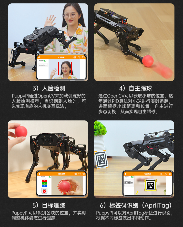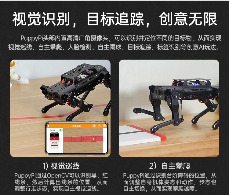 機器狗擁有第一視覺能實現更多有趣的Al 玩法,如目標追蹤、人臉辨識、視覺巡航、自主攀爬等。