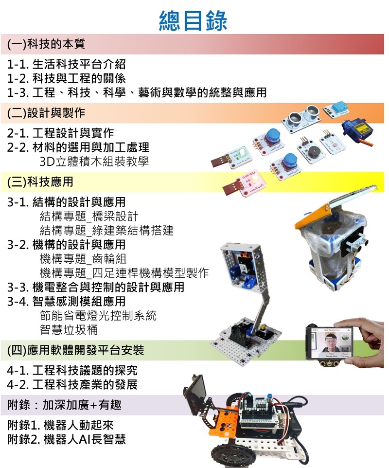 ▼以下目錄是隨車附贈生活科技課本,機器人僅適用部分內容,像是附錄中機器人動起來、AI人臉辨識等專題,想再了解生活科技相關資訊,請點選下方目錄。