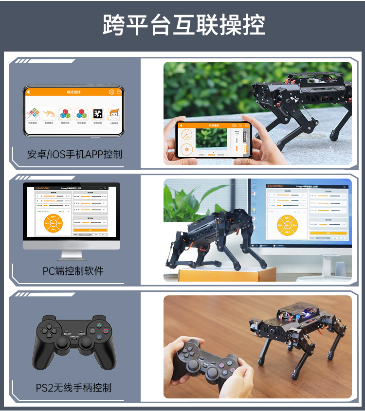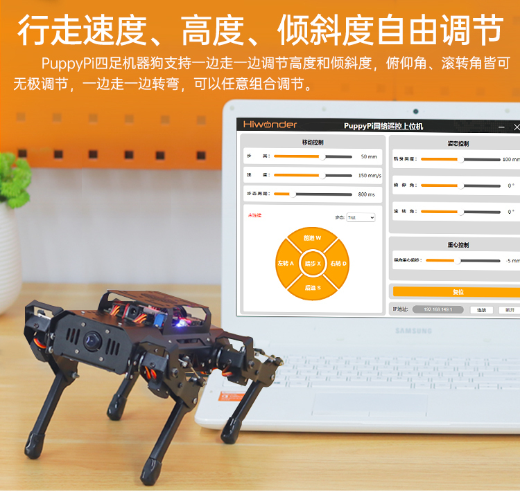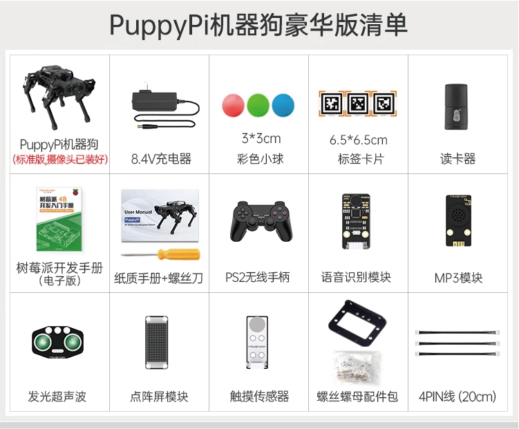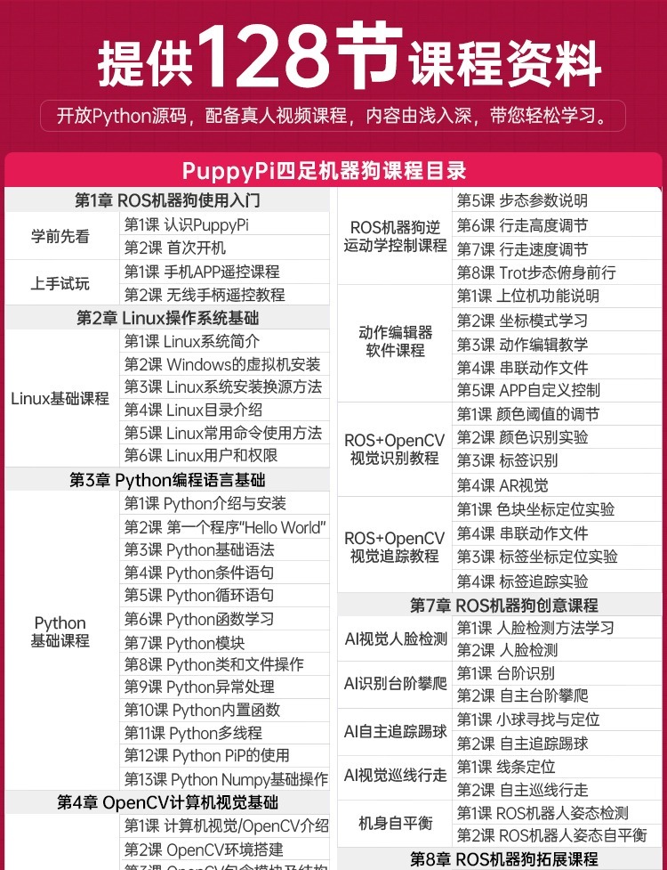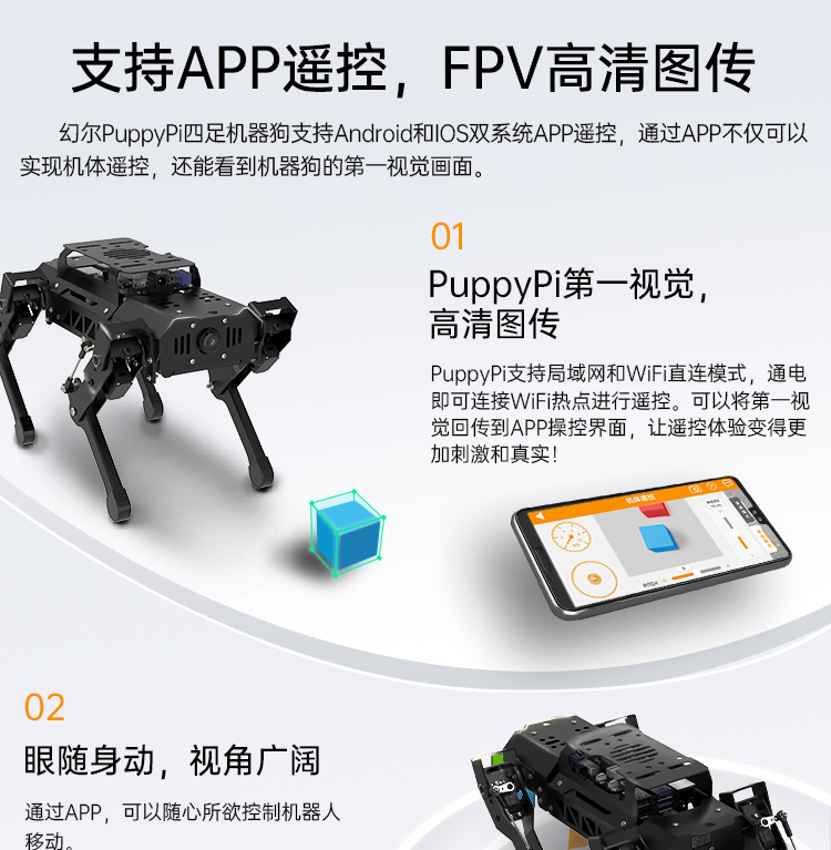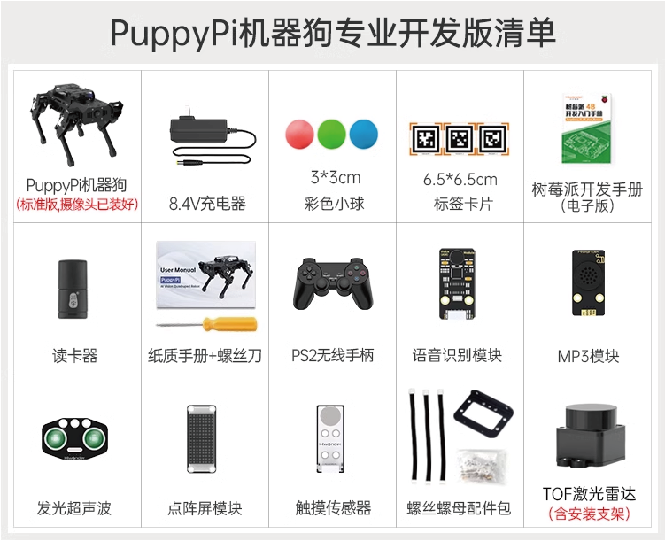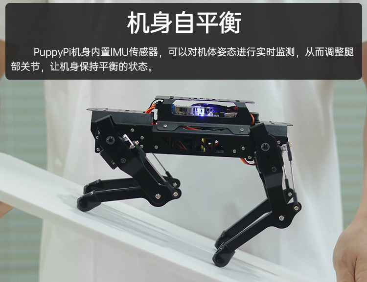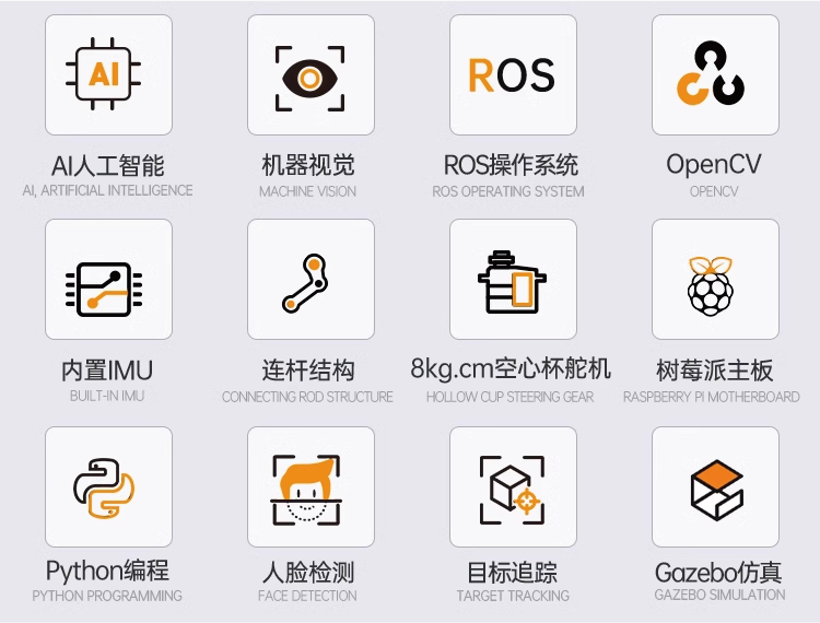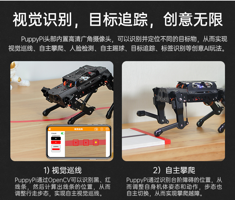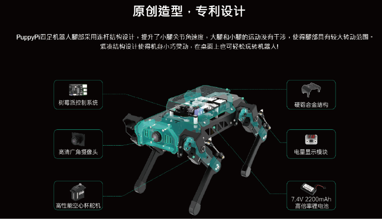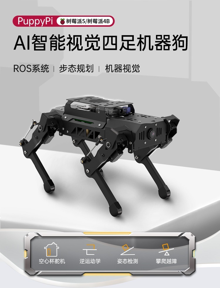 這是一款以樹莓派5為核心開發的AI視覺四足機器狗。機器狗採用全鋁合金機身結構並搭載8個高性能伺服馬達,腿部採用連桿結構設計,可以輕鬆實現自由行走、上下臺階等基本步態。機器狗擁有第一視覺能實現更多有趣的Al 玩法,如目標追蹤、人臉辨識、視覺巡航、自主攀爬等。機器狗採用ROS作業系統,支援Gazebo模擬能滿足用戶對機器視覺、機器人運動學、四足步態控制等演算法的學習和驗證。