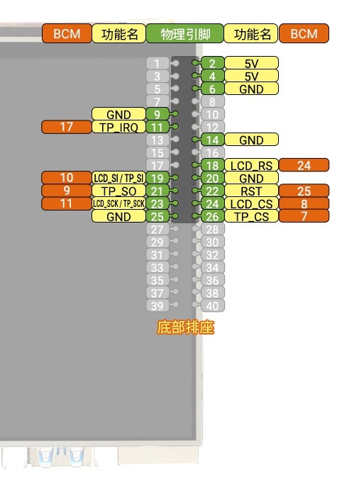 (1)、(17): 3.3V (電源 3.3V 電源輸入 )(2)、(4):5V ( 電源 5V 電源輸入 )(3)、(5)、(7)、(8)、(10)、(12)、(13)、(15)、(16):NC(6)、(9)、(14)、(20)、(25):GND ( 接地 )(11):TP_IRQ ( 觸控面板中斷,檢測到觸摸面板有按下則為低電平 )(18):LCD_RS ( 指令數據 寄存器選擇 )(19):LCD_SI / TP_SI ( LCD顯示 / 觸摸面板的SPI資料輸入 )(21):TP_SO ( 觸摸面板的SPI資料輸出 )(22):RST ( 復位 )(23):LCD_SCK / TP_SCK ( LCD顯示 / 觸摸面板的SPI時鐘信號 )(24):LCD_CS ( LCD片選信號,低電平選擇LCD )(26):TP_CS ( 觸摸面板片選信號,低電平選擇觸摸面板 )