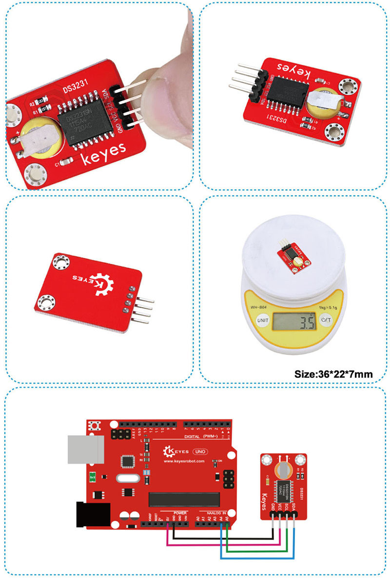 DS3231提供商用級和工業級溫度範圍,採用16引腳300mil 的SO封裝。模組自帶2個定位孔,方便你將模組固定在其他設備。