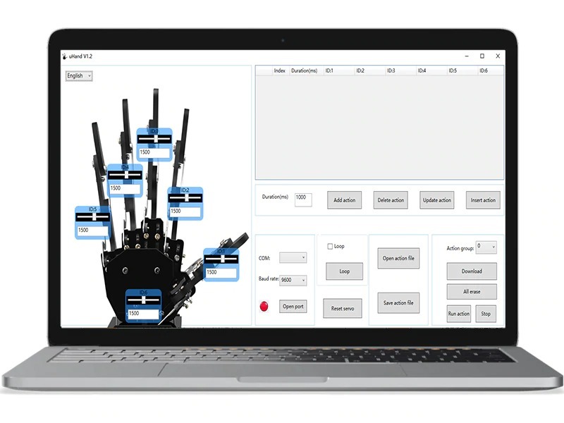 提供圖形化人機軟體,拖動滑桿即可控制機器人伺服機轉動,無需代碼,即可編輯機器人動作組。