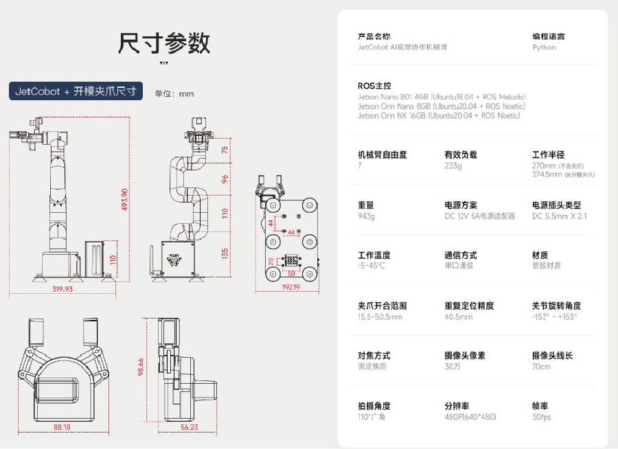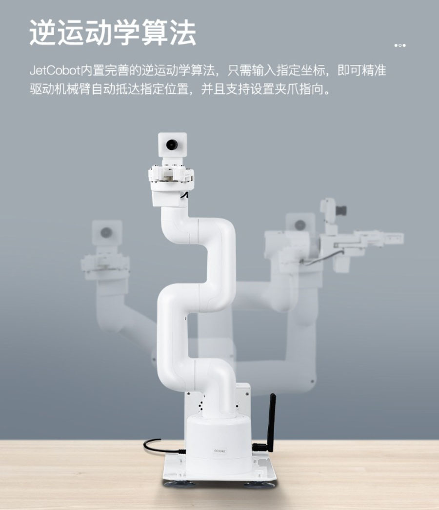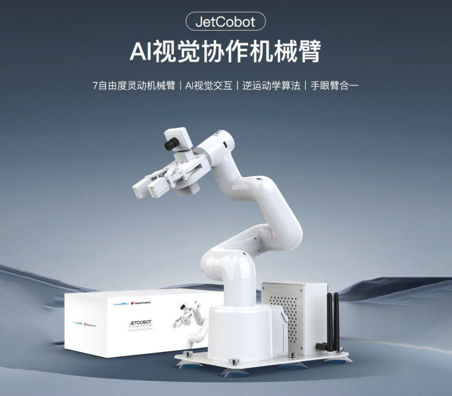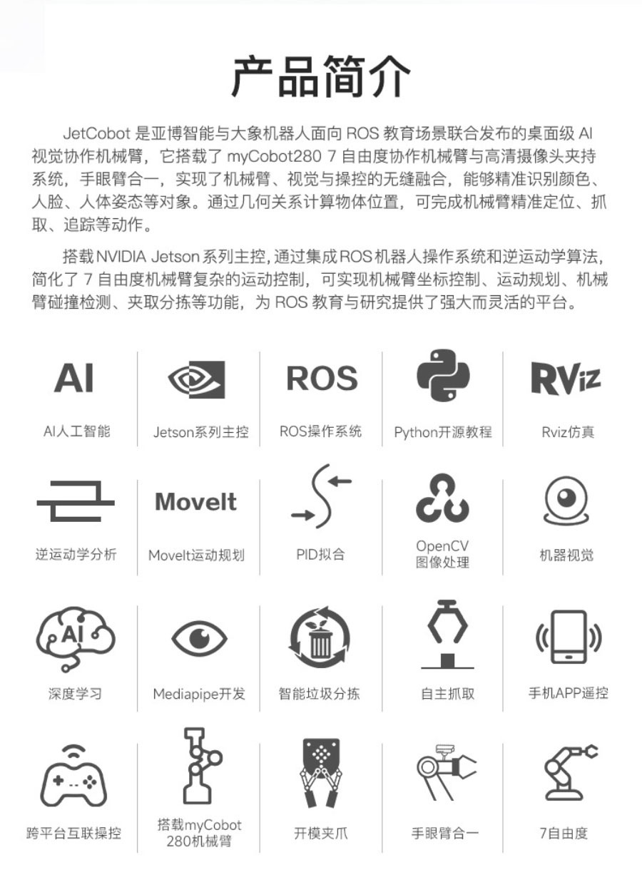 JetCobot是一款7軸視覺協作機械手臂。它採用NVIDIA系列開發板作為主控板。採用與UR機器人類似的配置,運動靈活,最大有效臂展270MM。透過ROS機器人操作系統和逆運動學演算法,實現機械手臂座標控制、運動規劃、抓取和分類功能。它配備了0.3MP USB攝像頭,結合OpenCV圖像、機器視覺、深度學習等演算法,可以完成色彩互動、人臉追蹤、標籤識別、模型訓練、手勢互動等功能。除了支援MoveIt模擬控制外,JetCobot還支援APP、手把、PC網頁控制。