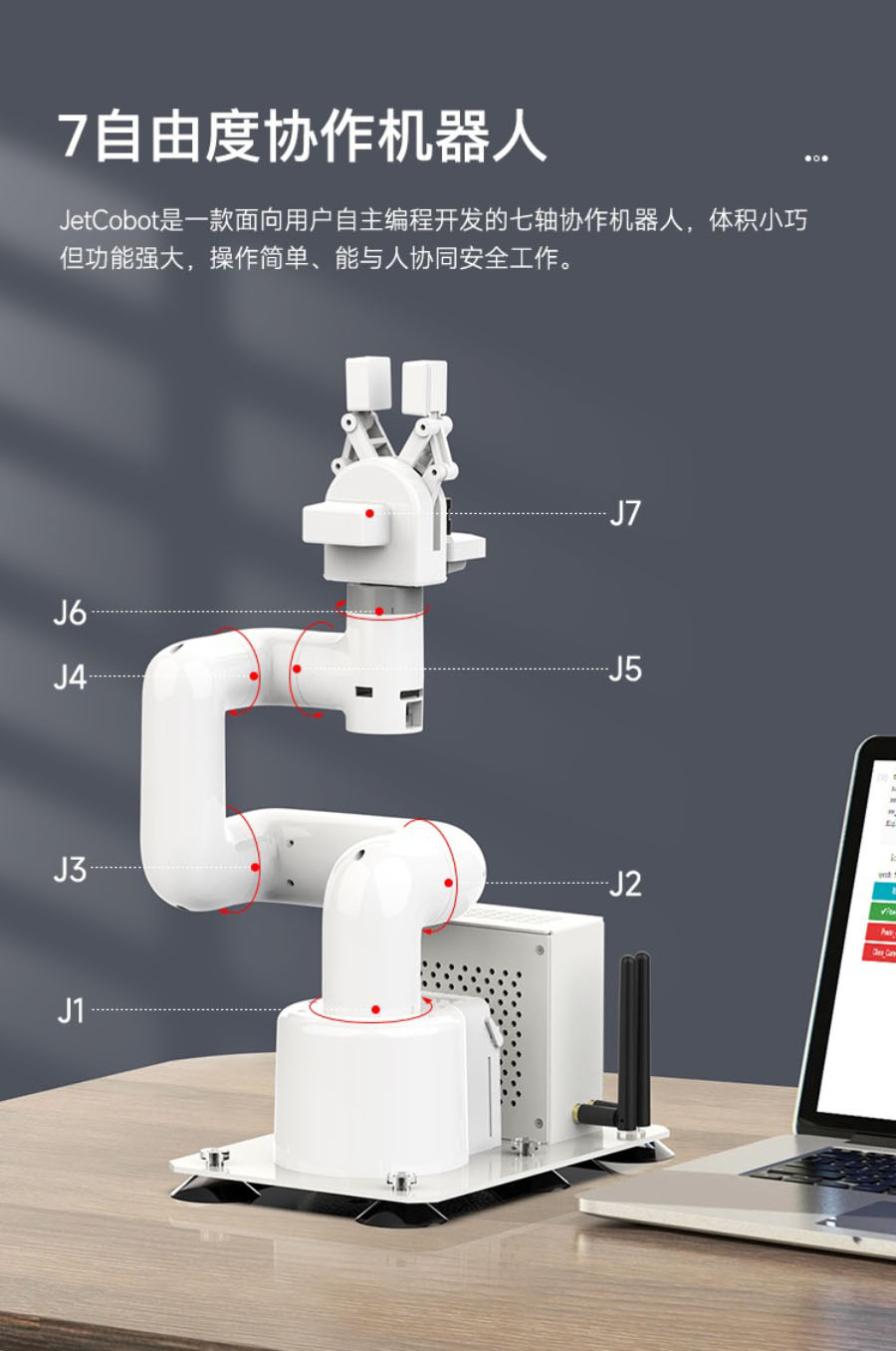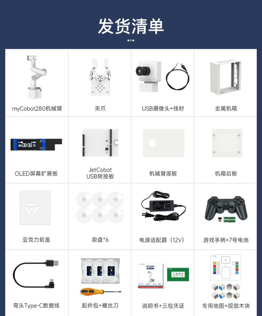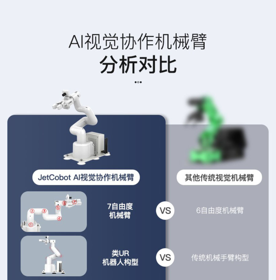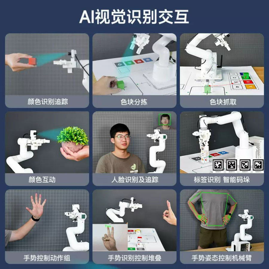 JetCobot是一款7軸視覺協作機械手臂。它採用NVIDIA系列開發板作為主控板。採用與UR機器人類似的配置,運動靈活,最大有效臂展270MM。透過ROS機器人操作系統和逆運動學演算法,實現機械手臂座標控制、運動規劃、抓取和分類功能。它配備了0.3MP USB攝像頭,結合OpenCV圖像、機器視覺、深度學習等演算法,可以完成色彩互動、人臉追蹤、標籤識別、模型訓練、手勢互動等功能。除了支援MoveIt模擬控制外,JetCobot還支援APP、手把、PC網頁控制。