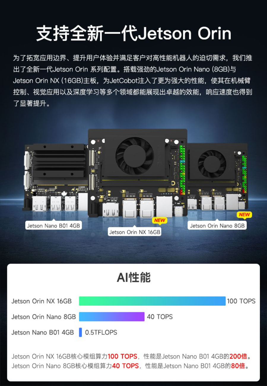 JetCobot以NVIDIA系列開發板為主控,擁有強大的運算能力和AI處理能力,能夠高效處理複雜的視覺和控制演算法,確保即時回應和高效執行。