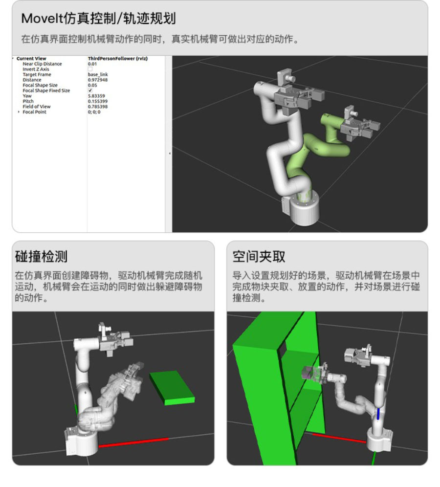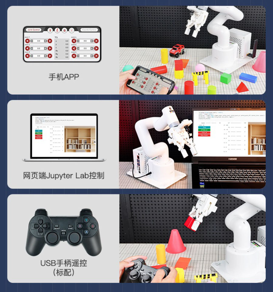 基於ROS機器人作業系統,JetCobot可實現MoveIt模擬控制,同時也支援APP控制(僅適用於Android)、手把控制和PC網頁控制。