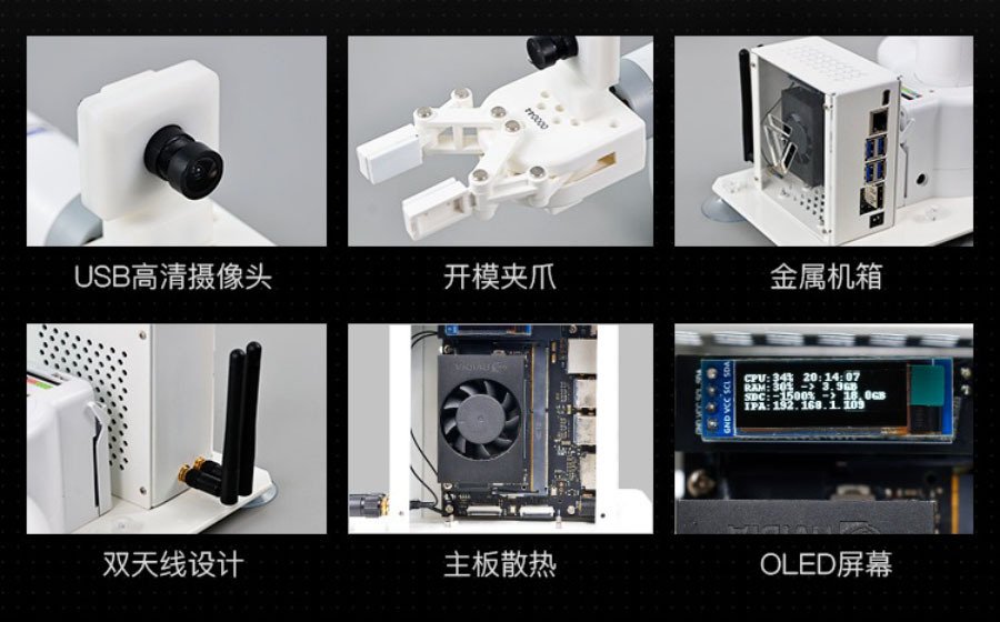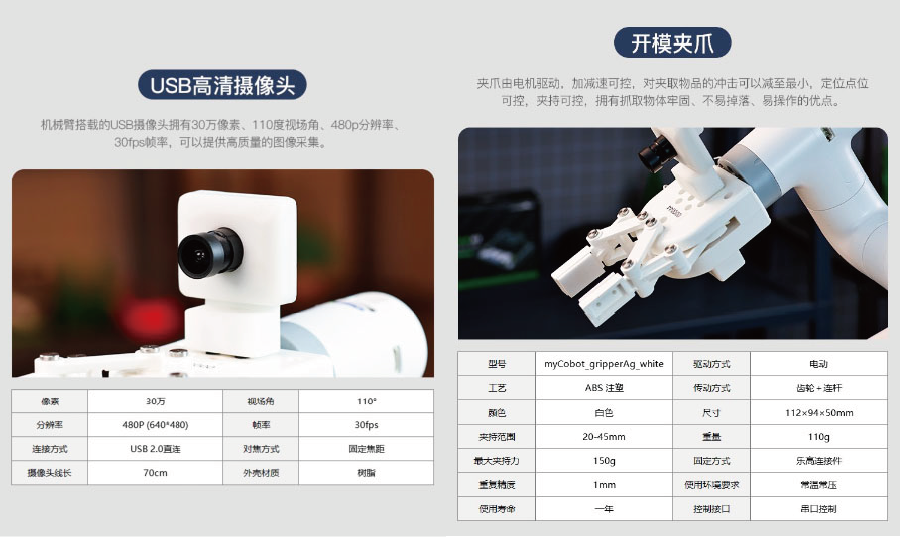 配備0.3MP USB鏡頭,視野110 ° 。結合OpenCV影像處理、機器視覺和深度學習演算法,JetCobot可以實現色彩互動、人臉追蹤、標籤辨識、模型訓練和手勢互動等功能。