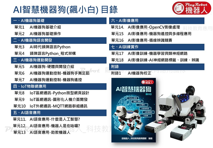 AI還可以這樣學,從玩Python開始到AI仿生機器人的互動與控制,從APP控制、手勢控制、自主循線、自主踢足球、即時控制到AI智慧客服、語音控制…等還有更多有趣的互動內容喔!