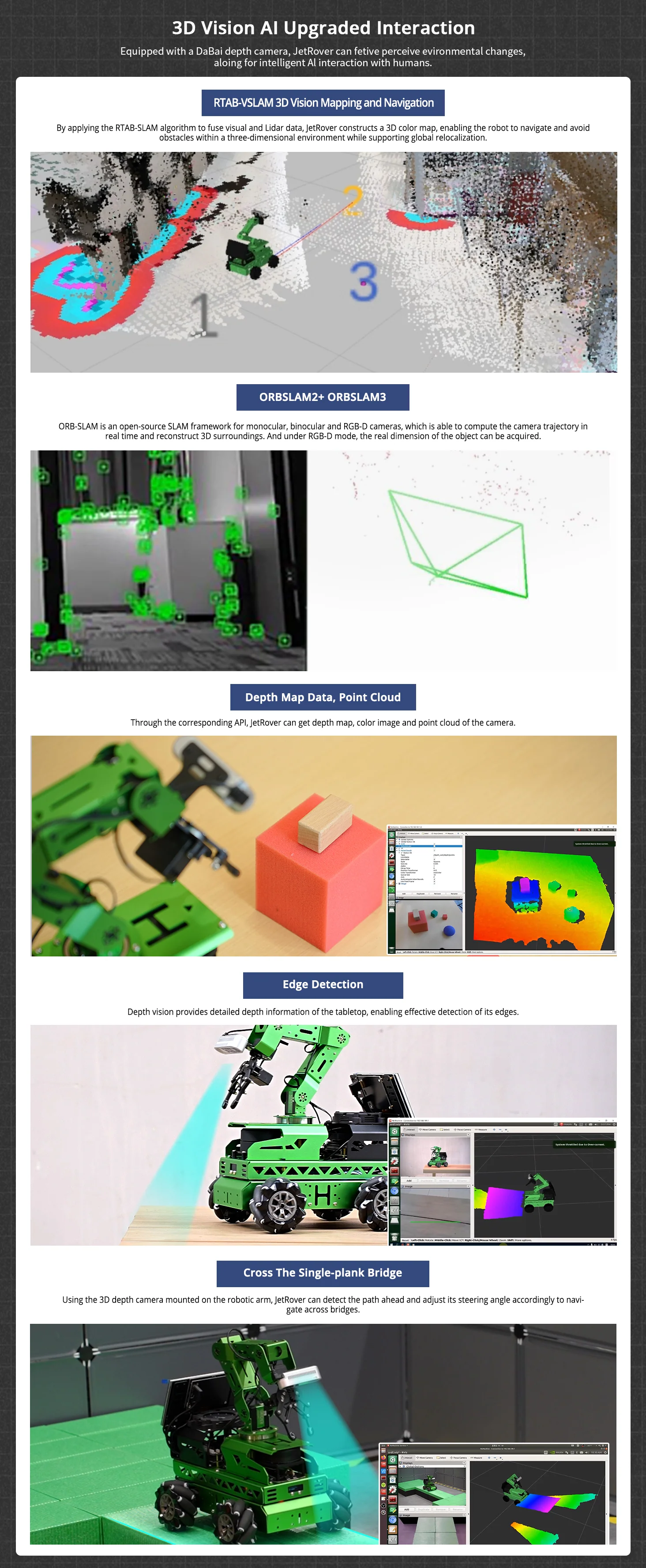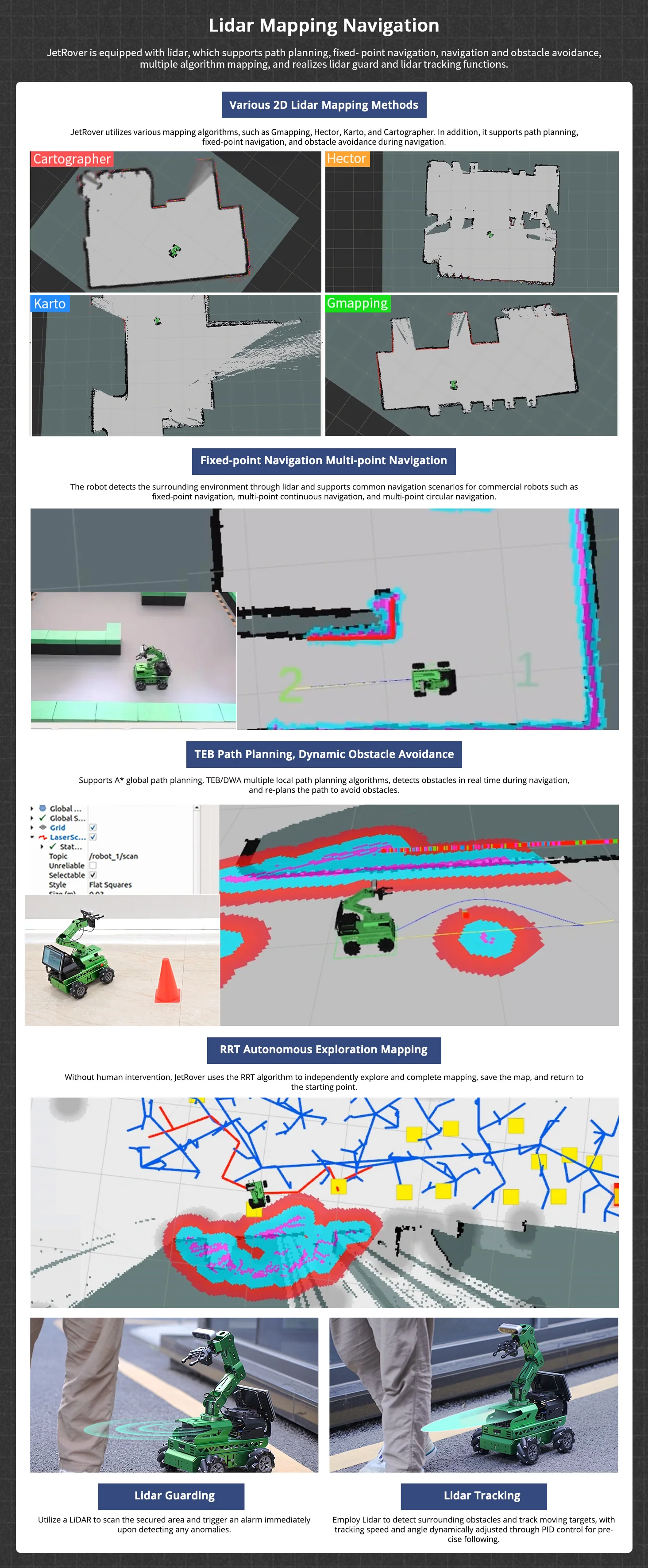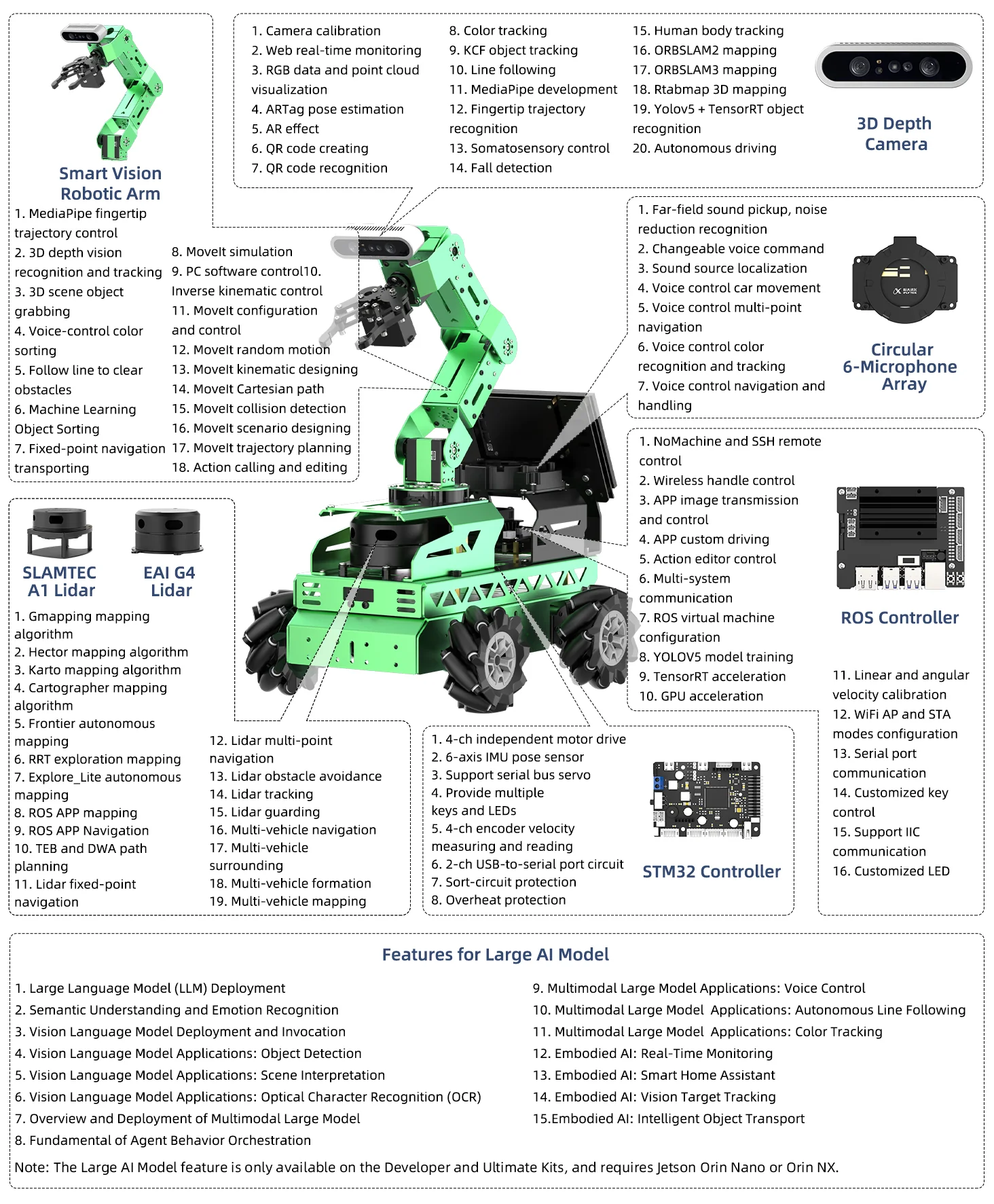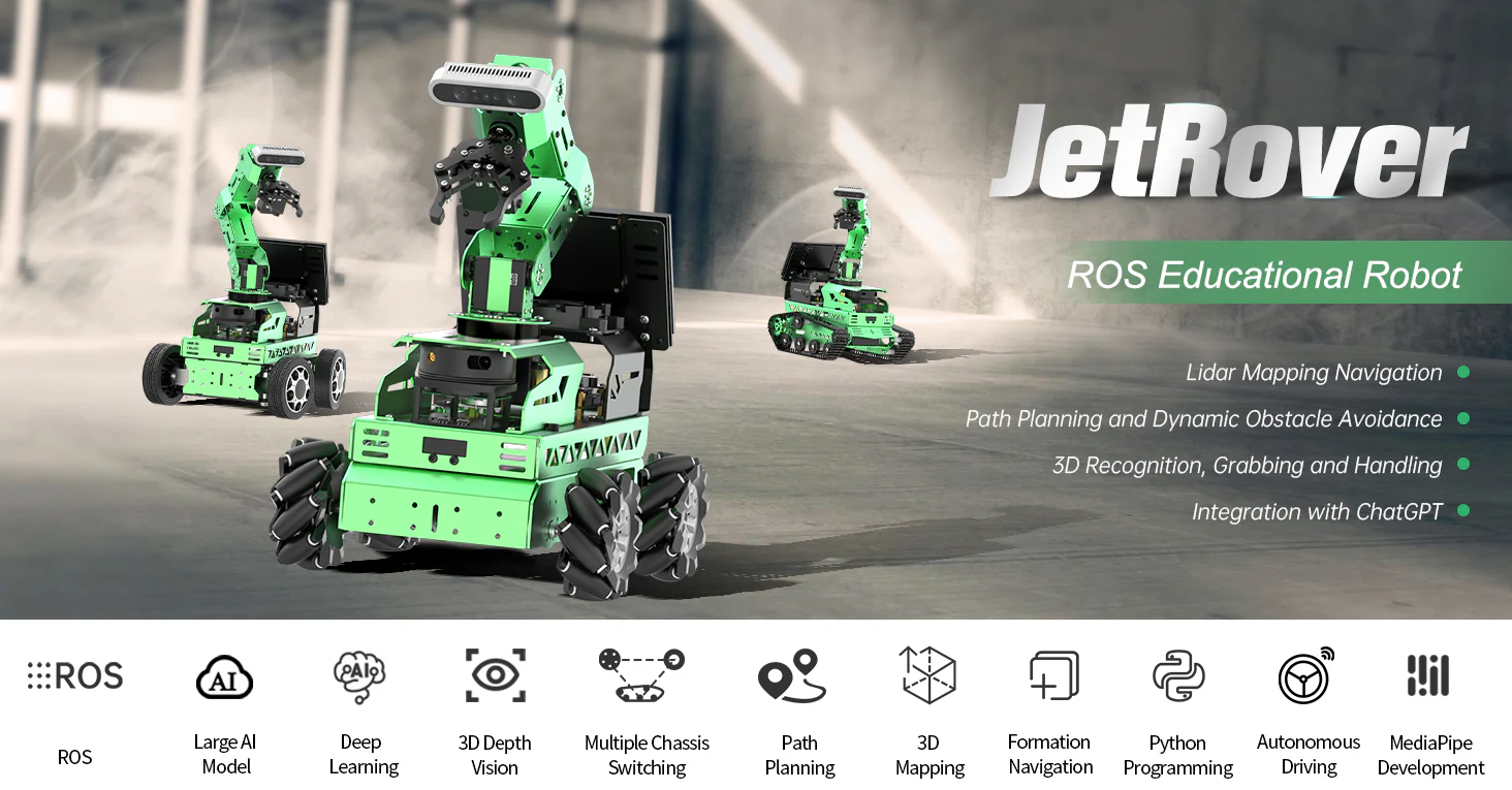 JetRover 是一款專為 ROS 教育場景所打造的複合型機器人,搭載 NVIDIA Jetson Orin 運算平台,配備高性能磁編碼馬達與六自由度機械手臂,同時整合多項高階硬體設備,包括 LiDAR、3D 深度攝影機、7 吋 LCD 螢幕,以及遠場麥克風陣列,可實現機器人運動控制、建圖導航、路徑規劃、追蹤與避障、自主駕駛、3D 抓取、導航與搬運、體感互動、遠場語音互動、群控編隊等多種應用。