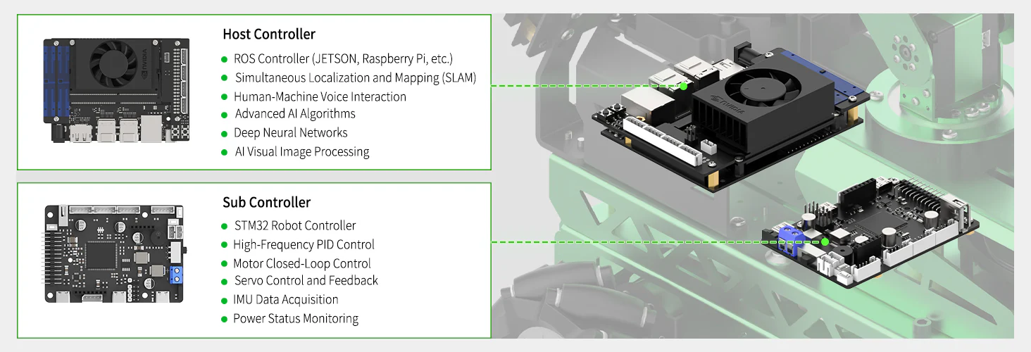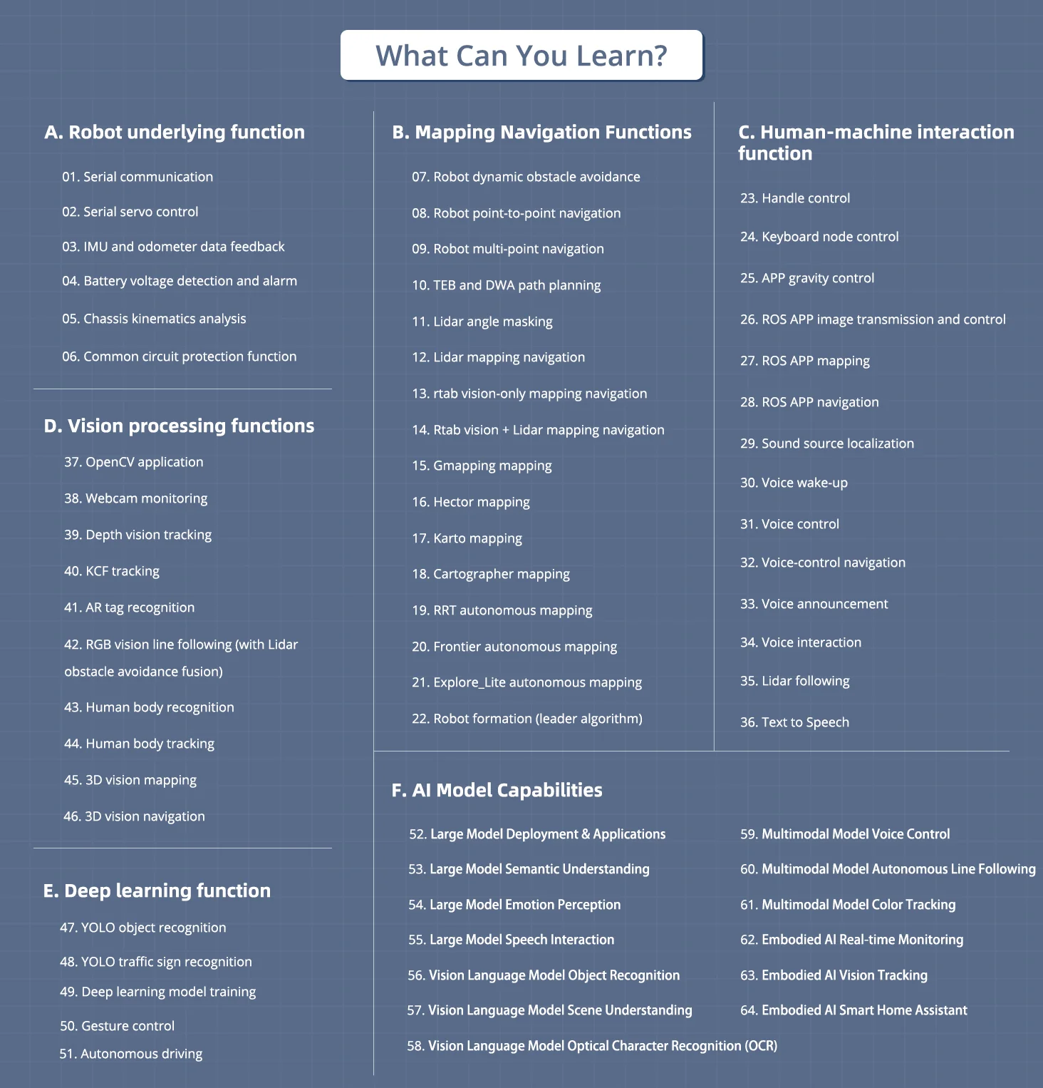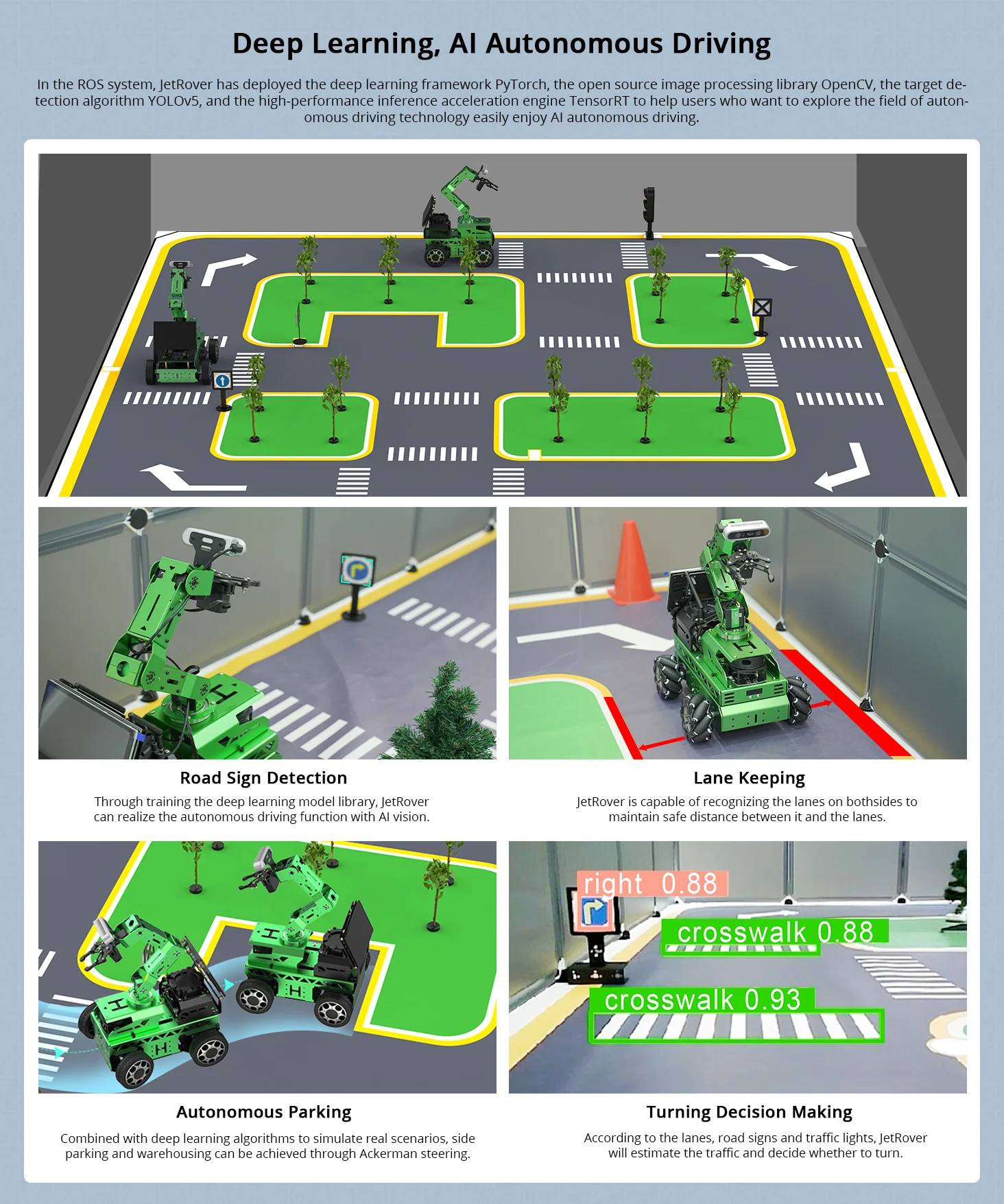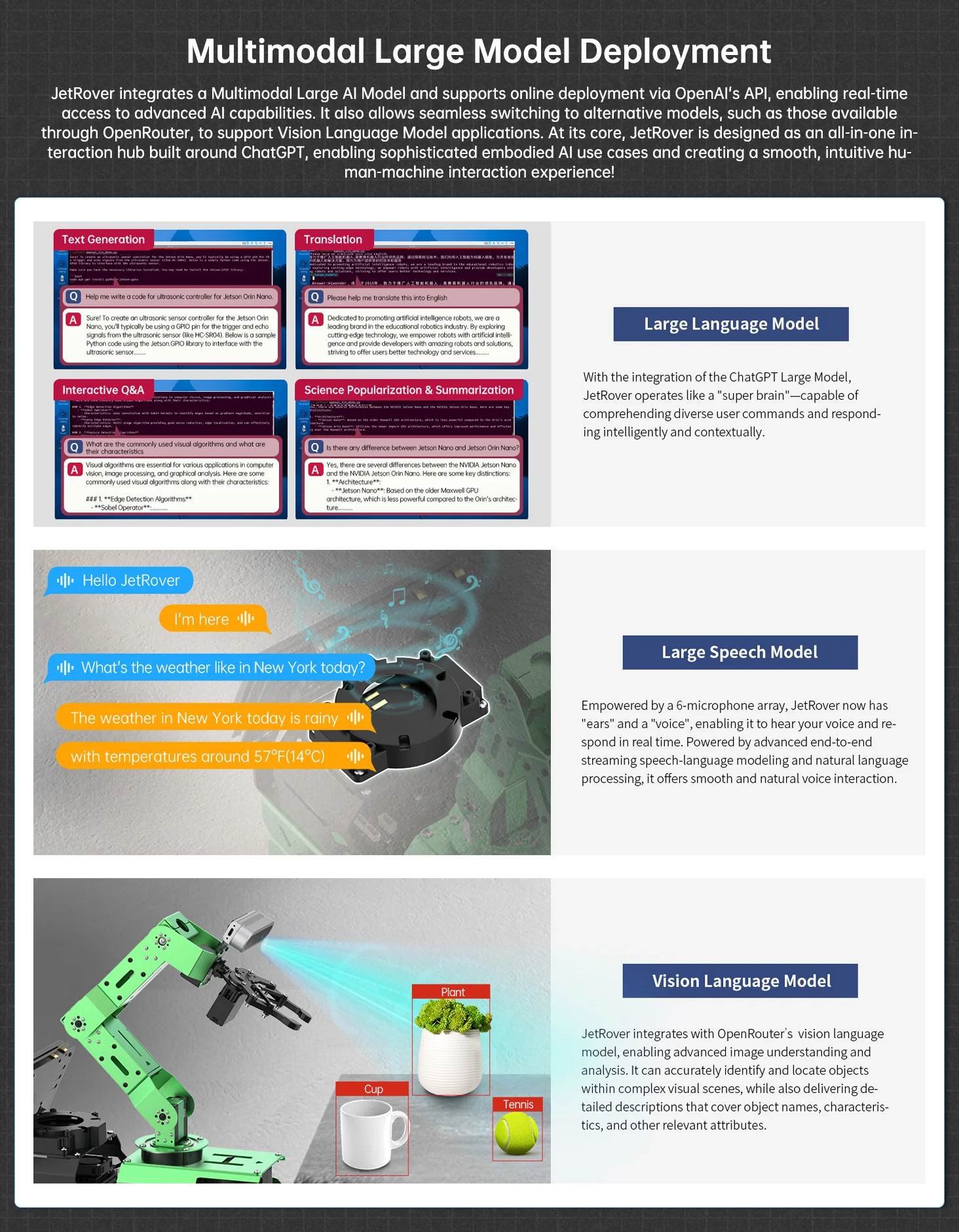 JetRover 是一款專為 ROS 教育場景所打造的複合型機器人,搭載 NVIDIA Jetson Orin 運算平台,配備高性能磁編碼馬達與六自由度機械手臂,同時整合多項高階硬體設備,包括 LiDAR、3D 深度攝影機、7 吋 LCD 螢幕,以及遠場麥克風陣列,可實現機器人運動控制、建圖導航、路徑規劃、追蹤與避障、自主駕駛、3D 抓取、導航與搬運、體感互動、遠場語音互動、群控編隊等多種應用。