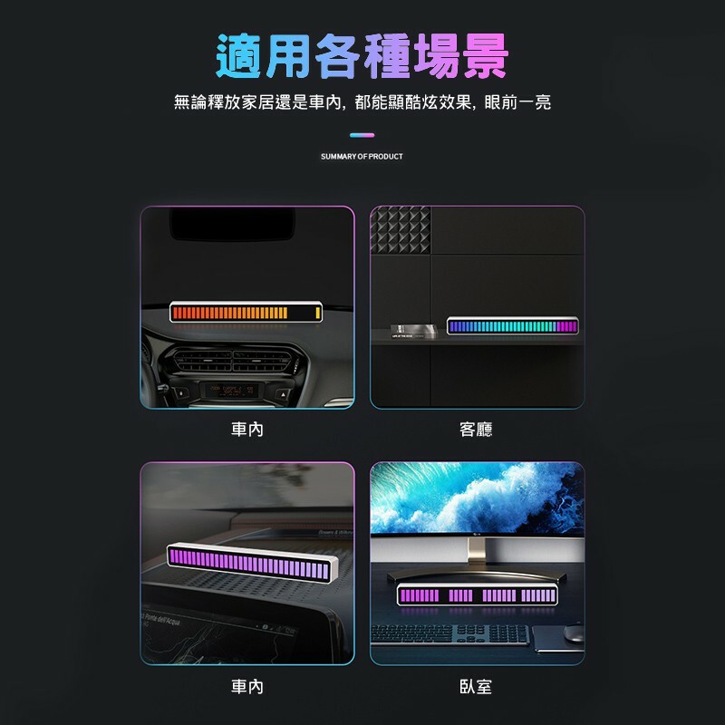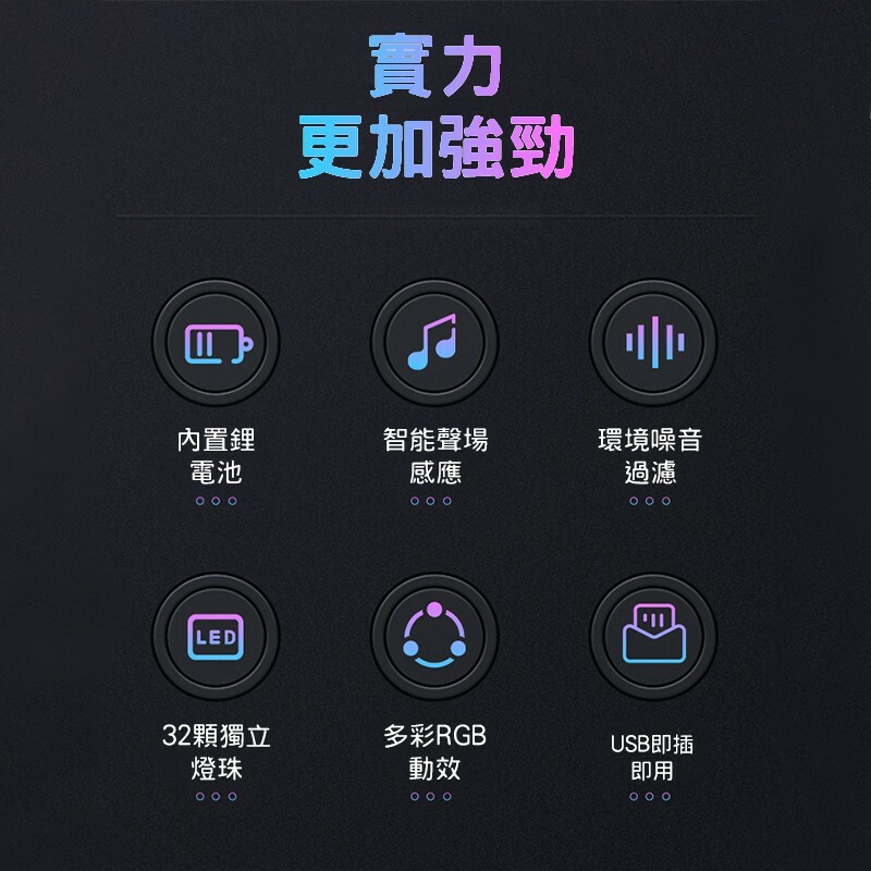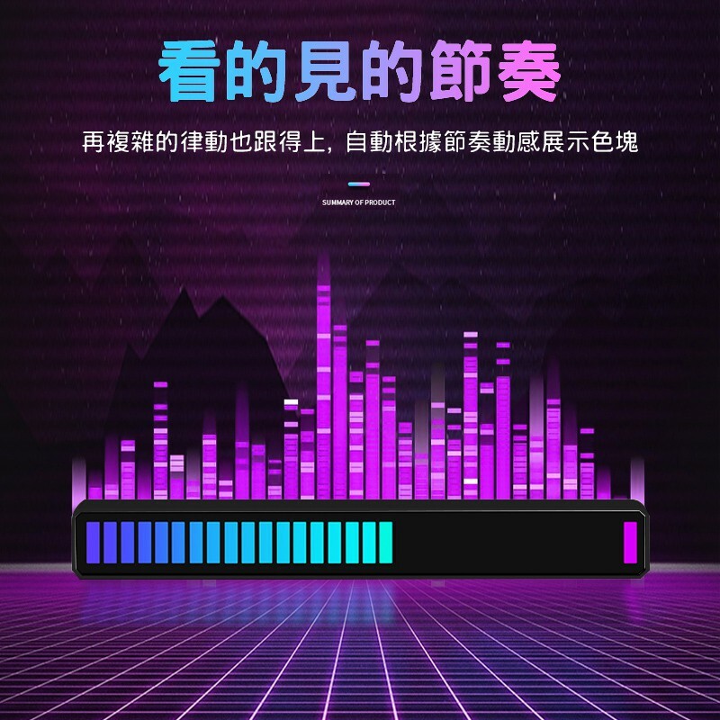 拾音節奏燈由32顆RGB LED集成並內置了高靈敏麥克風,通過拾取環境聲音/音樂,回饋同步節奏的光譜。內置AGC演算法(自動增益)和環境噪音消除功能。有很多動畫/色彩組合/主題風格可供選擇,只需要Micro-USB供電即可獨立工作使用。高靈敏無延遲,能精准匹配聲場音樂。當無音樂的時候,20秒後會進入待機模式,當持續的音樂5秒待機模式自動喚醒。