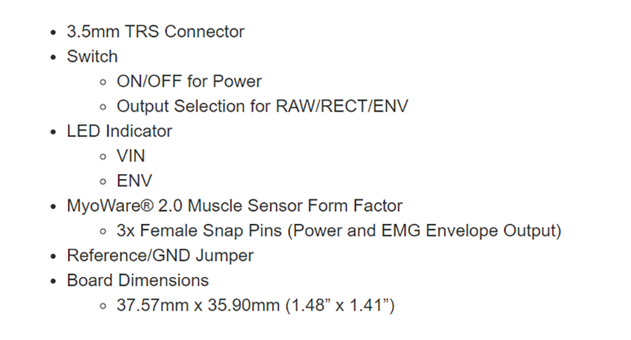 【產品特色】MyoWare® 2.0 Link Shield 旨在輕鬆地將 MyoWare 2.0 肌肉感應器連接至 Arduino 微控制器。此連結器提供一個 3.5mm TRS 插孔,讓您可以使用 3.5mm TRS 對 TRS 連接線將電路板連接起來。MyoWare 2.0 Link Shield 板上配備了卡扣式連接器,因此您可以輕鬆地將它連接到 MyoWare 2.0 肌肉感測器的頂端。電路板也包含兩個開關。其中一個用於電源,另一個用於選擇原始 EMG (RAW)、整流 (RECT) 或包络 (ENV) 訊號的輸出模式。內建兩個 LED 狀態指示燈,分別用於電源和包絡訊號。還有一個跳線用於參考或接地。您需要 MyoWare 2.0 Arduino Shield 和 Arduino Uno R3 開發板,以連結每個 MyoWare 2.0 肌肉感測器和 Link Shield。