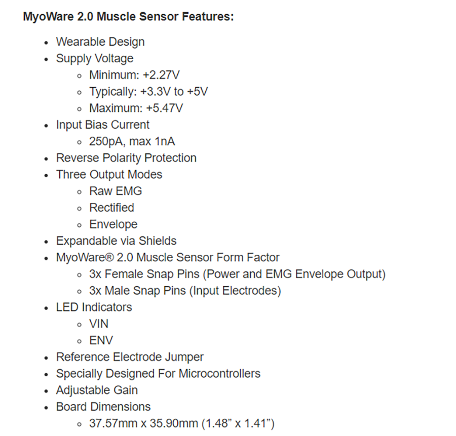 【產品特色】MyoWare® 2.0 肌肉感測器基本套件是與 Arduino 相容的多合一肌電圖 (EMG) 感測器套件,為您提供 MyoWare 2.0 生態系統中最基本的功能,讓您可以開始量測和視覺化肌肉活動。只需安裝 MyoWare 2.0 LED Shield、添加一些 EMG 感測器墊,將感測器固定在肌肉群上,然後彎曲即可!套件中還包含一把迷你螺絲起子,可輕鬆取下擴充板;USB A 至 C 連接線,可為 40mAh LiPo 電池充電;以及 MyoWare 2.0 連接線,可連接至大肌肉群。本套件所含的 MyoWare 2.0 肌肉感應器經過重新設計,採用全新的易用型精巧設計,並已升級為最新、最先進的晶片組,可改善感應器的效能與可靠性。感應器透過肌肉的電勢測量肌肉活動,通常稱為表面肌電圖 (EMG 或簡稱 sEMG)。當您的大腦告訴您的肌肉要彎曲時,會傳送一個電子訊號給您的肌肉,讓您的肌肉開始招募運動單位 (肌肉纖維束,在肌肉後面產生力量)。您越用力彎曲,就會招募越多的運動單位,以產生更大的肌肉力量。運動單位的數量越多,肌肉的電流活動就會增加。MyoWare 2.0 肌肉感應器會分析經過濾波與整流的肌肉電流活動,並輸出訊號 (0-VIN 伏特,其中 VIN 代表電源電壓),代表肌肉彎曲的強度。MyoWare 2.0 LED Shield 採用創新的卡扣式連接器系統,無需焊接連接。藍色的 10 段柱狀 LED 提供量測訊號的視覺呈現。測得的肌肉活躍度越高,板上的 LED 就會越亮!此開發套件包含 MyoWare 2.0 生態系統的所有電路板及配件,不需要微控制器。使用它來測量您在鍛鍊肌肉時的用力程度、作為教學工具,或是為您的萬聖節服裝增添一些肌電的特色!