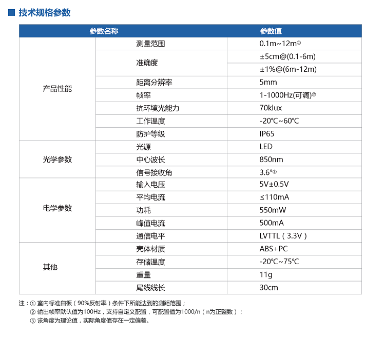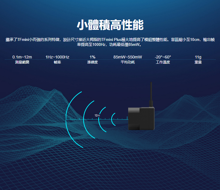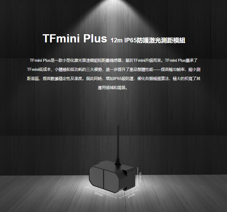 TFmini Plus是一款以TOF(飛行時間)原理,配合獨特的光學、電學、演算法設計,主要實現穩定、精準、高靈敏度和高速的距離測量的功能。