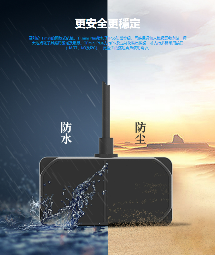 產品本身除了具有TFmini的低成本、小體積、低功耗等特點外,還增加了IP65等級防護,對於室外強光、不同溫度、不同反射率等不同環境下具有更強的適應力。