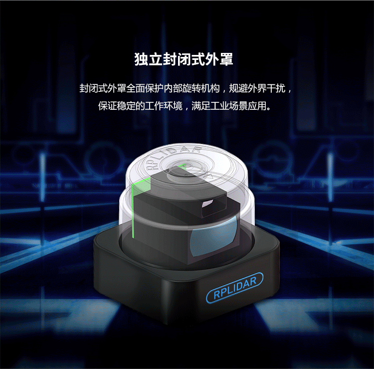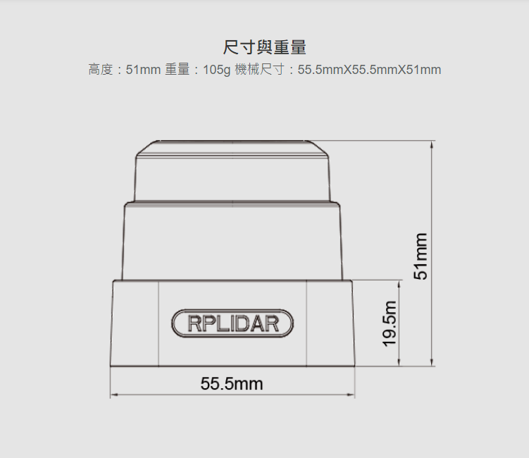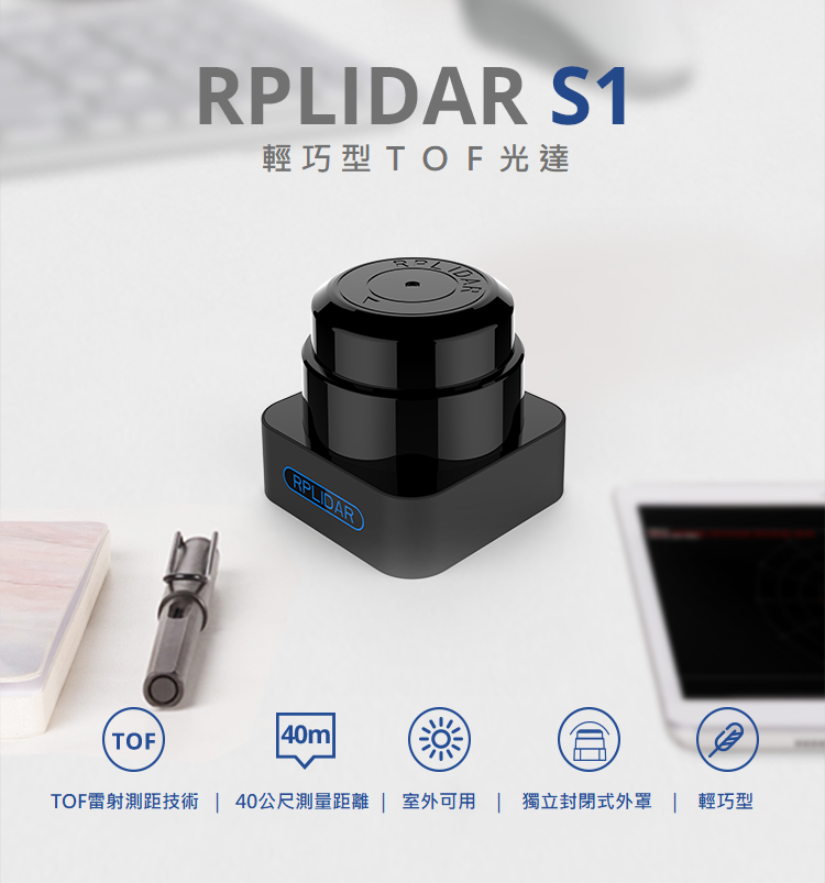 RPLIDAR S1 是一款輕巧型低成本 TOF 光達(TOF LIDAR),它具有每秒9200次的測量採樣能力,並採用了非接觸式的傳輸技術,克服了傳統光達的壽命限制,可長時間的穩定運行。