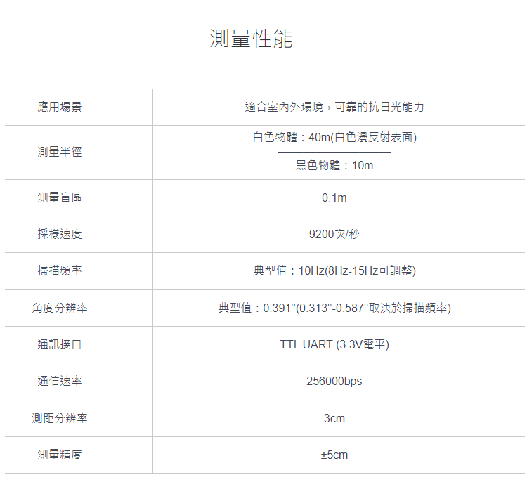 RPLIDAR S1的預設掃描頻率為10Hz (600rpm),並可隨使用需求,在8-15Hz範圍內任意調整掃描頻率;在10Hz的掃描頻率下,9.2kHz 的測量頻率可以實現0.391°的角度分辨率。
