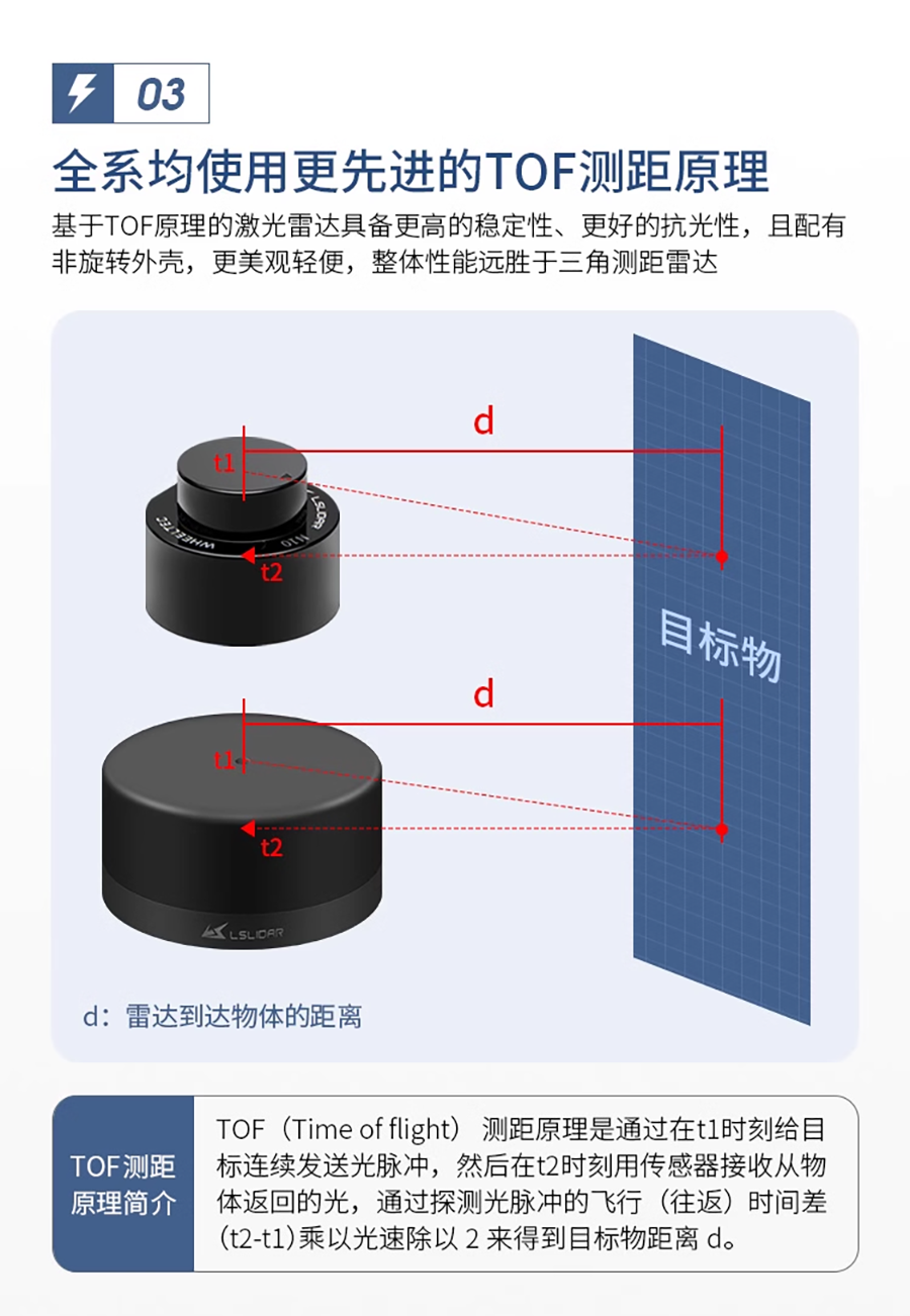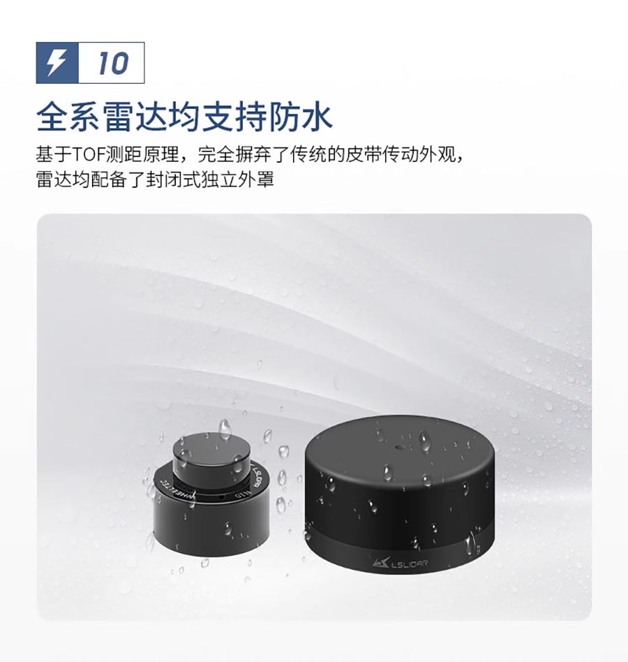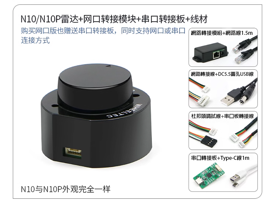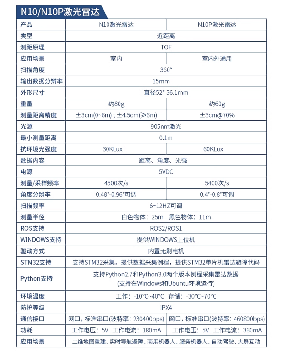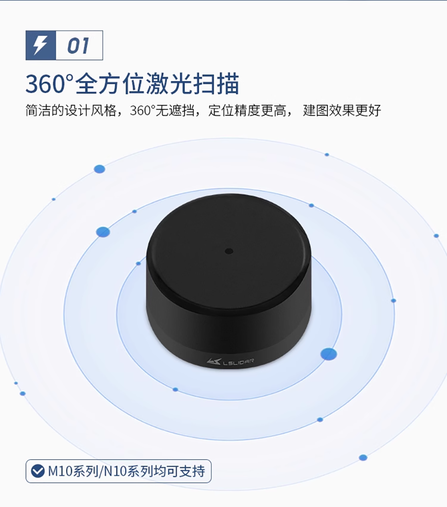 LS LiDAR N10|N10P 光達 採用TOF(飛行時間)原理,能夠對周圍360°環境進行二維掃描檢測。採用無線供電和光通信,測量頻率為6~12Hz。 精度達到±3公分,最大範圍為25公尺。主要應用於室內服務型機器人、掃地機器人、無人機...等精準定位避障應用。