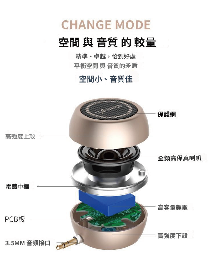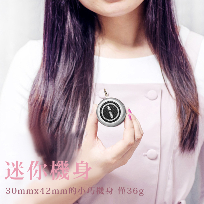 .產品型號:A5.音箱電源:3.7V 350mAh.輸出功率:3W.信 噪 比:≥80dB.輸出抗阻:60HM.頻率響應:50-18000HZ.THD+N :3%.喇叭尺寸:1.4吋.產品尺寸:46*46*33mm