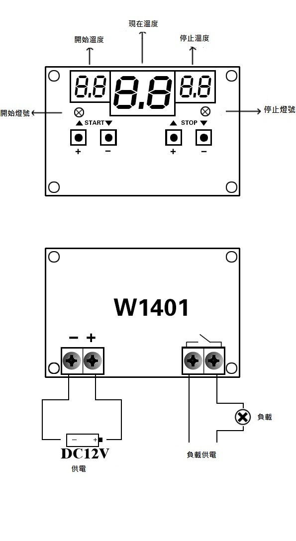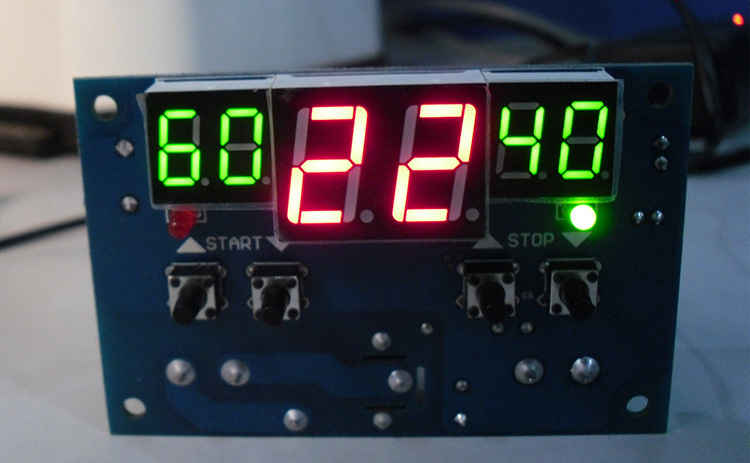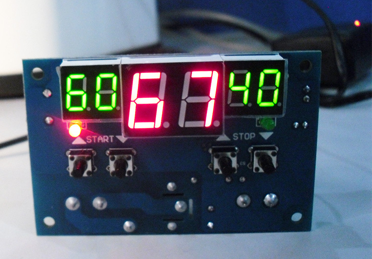 2.低溫啟動-加熱模式:設定開始溫度值<停止溫度值時,當檢測溫度≤開始溫度時,繼電器閉合,制熱設備工作;當檢測溫度≥停止溫度時,繼電器斷開,制熱設備停止工作。
