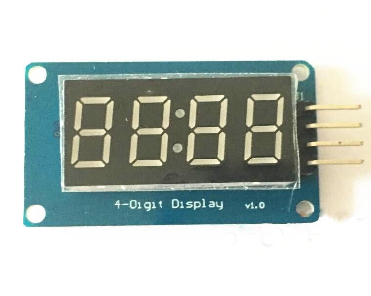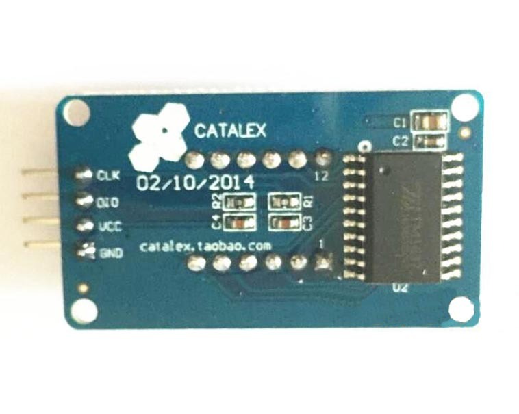 4位七段顯示器模組,是一個12腳的帶時鐘點的4位共陽七段顯示器(0.36英寸)的模組,驅動晶片為TM1637,只需2根信號線即可使單晶片控制4位七段顯示器。