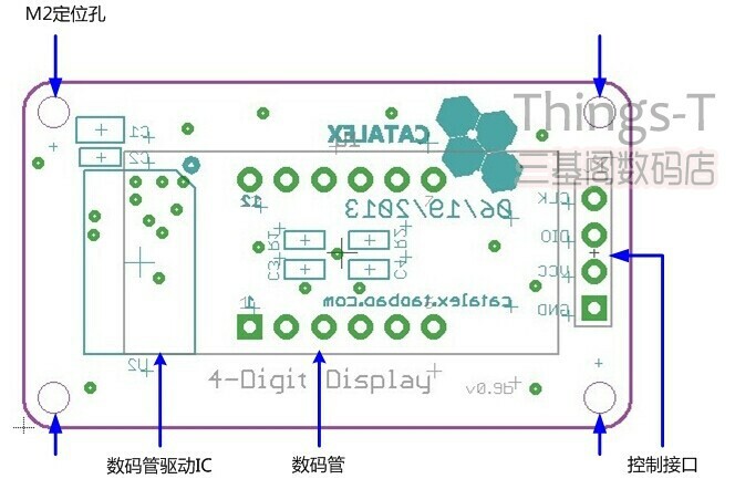 控制接口:共4個引腳(GND、VCC、DIO、CLK),GND為接地,VCC為電源,DIO為數位輸入/輸出,CLK為時鐘訊號腳。