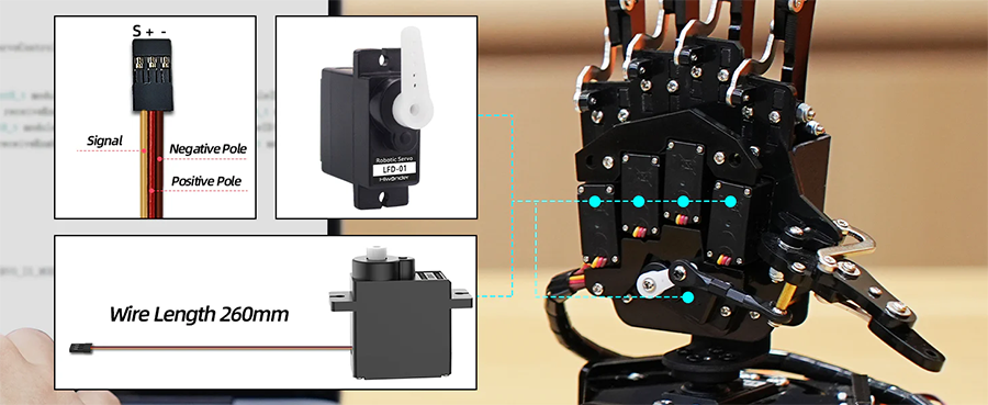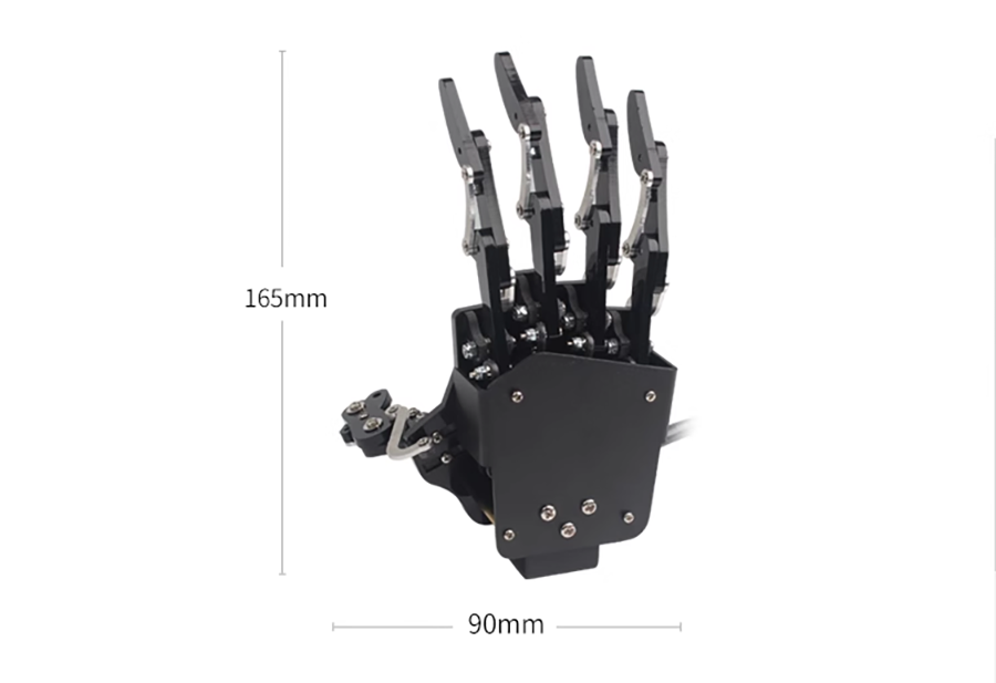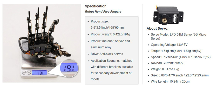 【產品特色】機械手掌採用壓克力盒鋁合金作為支架,五個LFD-01防堵轉伺服機驅動五根手指。手掌仿生真人1:1手指,結構輕巧,使用於機器人二次開發LFD-01伺服機內置堵轉保護算法,保證伺服機不會因為堵轉、碰撞而燒壞,從而大大延長伺服機使用壽命