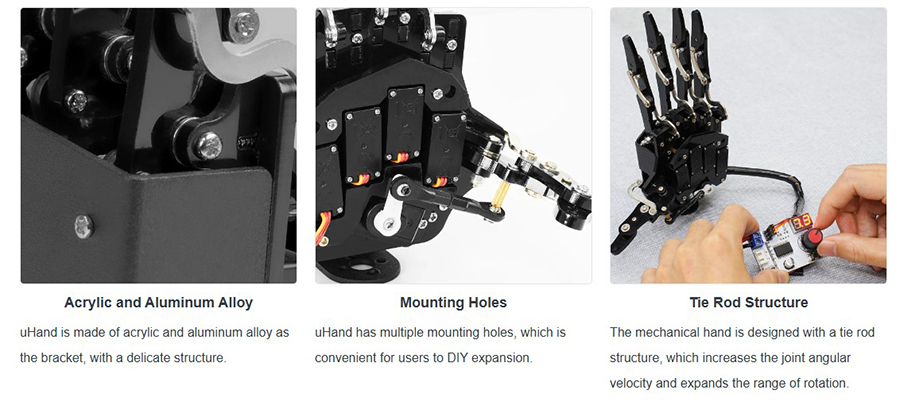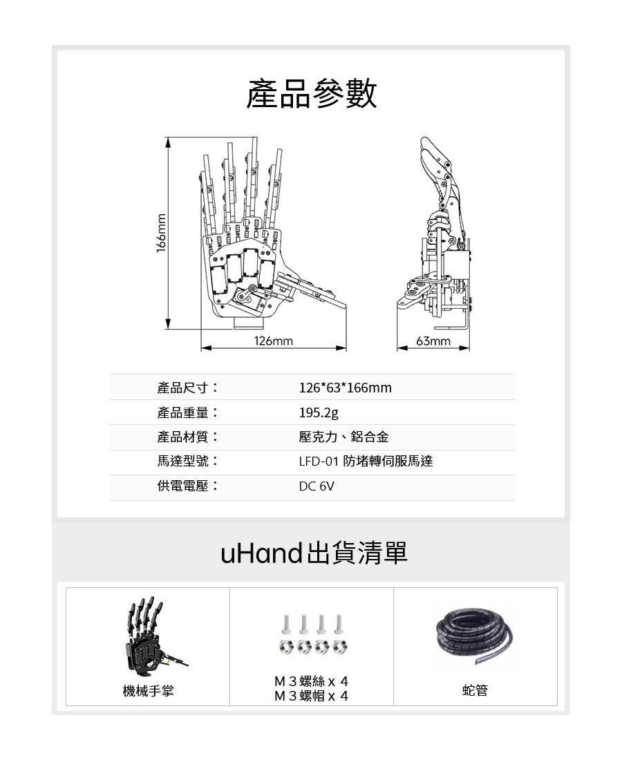 ●使用者友善的 1:1 比例仿生手指●LFD-01 防卡伺服器用於手指運動●壓克力與鋁合金支架提供結構穩定性與高效能●支援機器人的二次開發