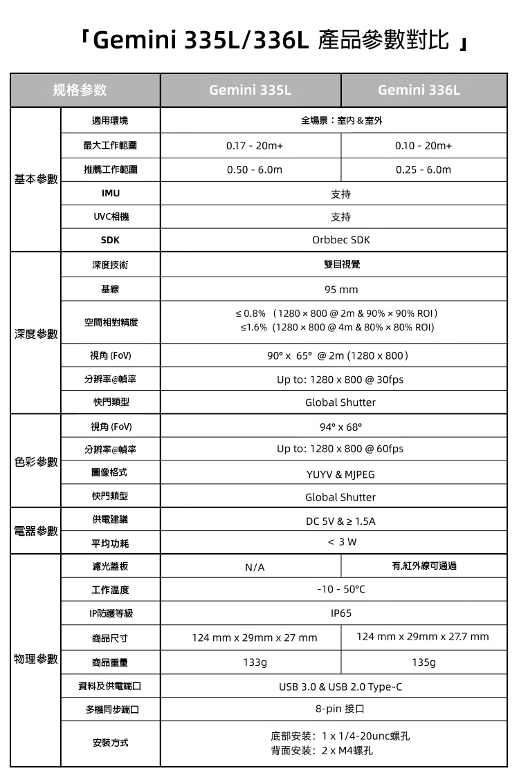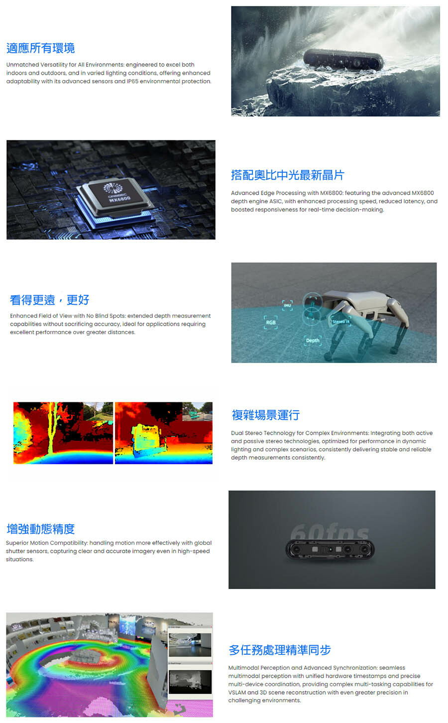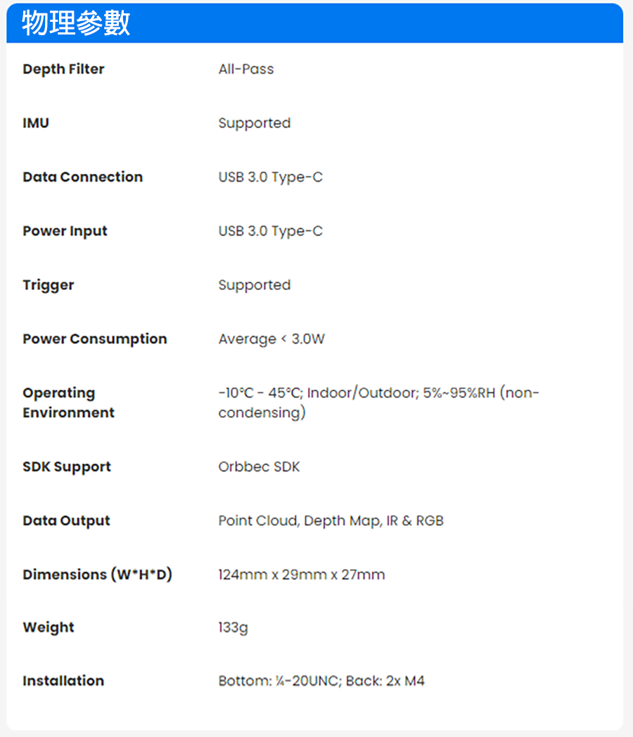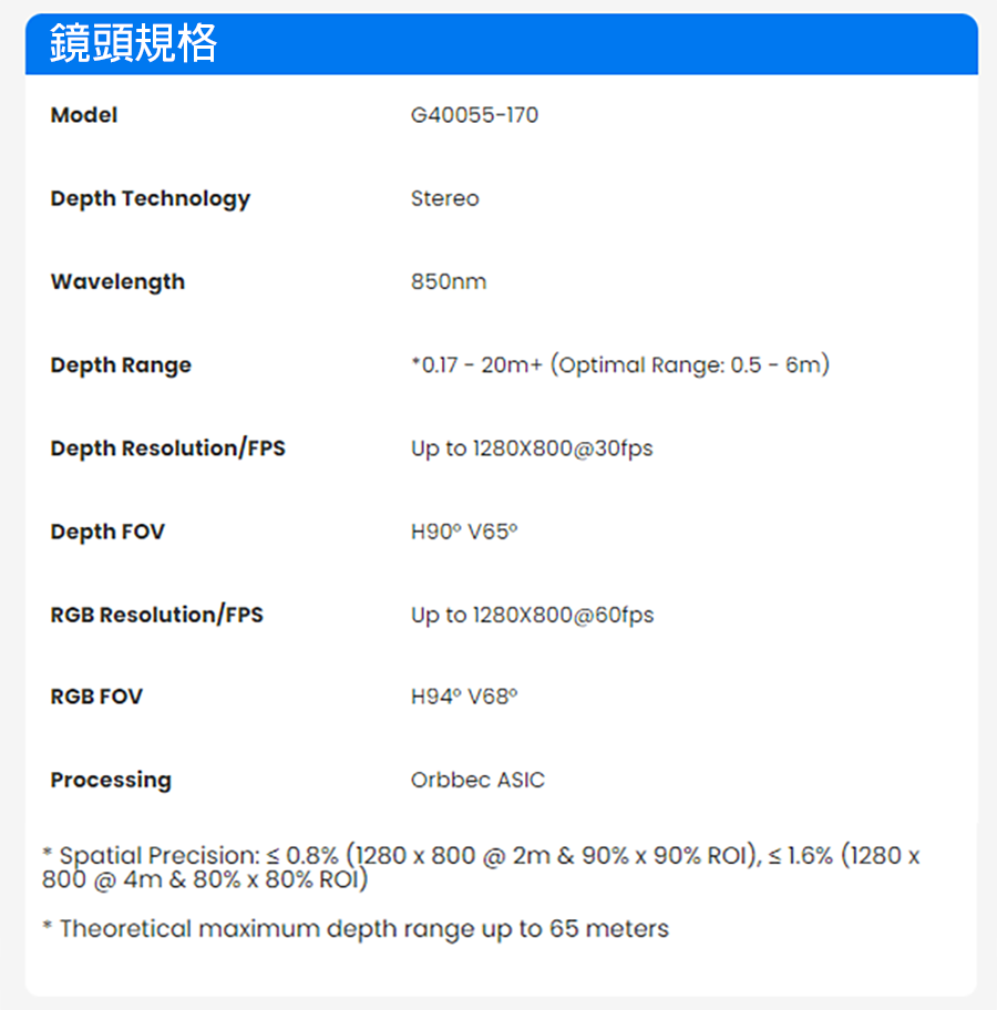 2. 高性能光學系統:採用 Orbbec 最新客製化 ASIC MX6800,提供高質量深度數據