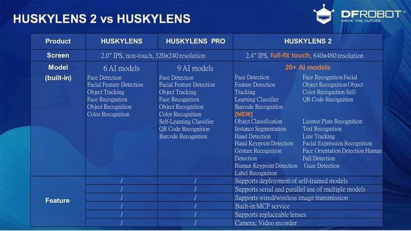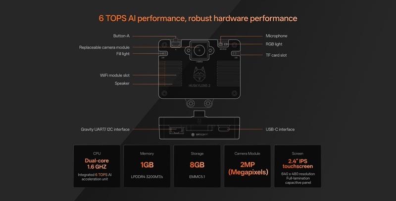 HUSKYLENS2是一款簡單易用、玩法多樣的AI視覺感測器,採用6TOPS算力專用AI晶片,預置人臉識別、目標檢測、物體分類、姿態識別、實例分割等20餘種開機即用的AI模型。同時,使用者還可部署自行訓練的模型,教會HUSKYLENS2識別任意目標物體。完美相容Arduino、micro:bit、ESP32、UNIHIKER(M10、K10)、掌控板、RaspberryPi等主流控制器,為智慧型機器人、工業自動化、教育科研等多元場景提供多才多藝的視覺解決方案。