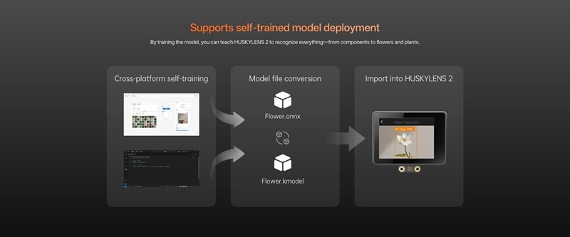 HUSKYLENS2AI視覺感測器提供完整的自訓練模型部署解決方案,支援使用者從模型訓練到實際應用的全流程自主定制。突破預置模型限制,允許使用者根據特定需求訓練專屬識別模型,實現從"通用識別"到"專屬認知"的能力跨越。