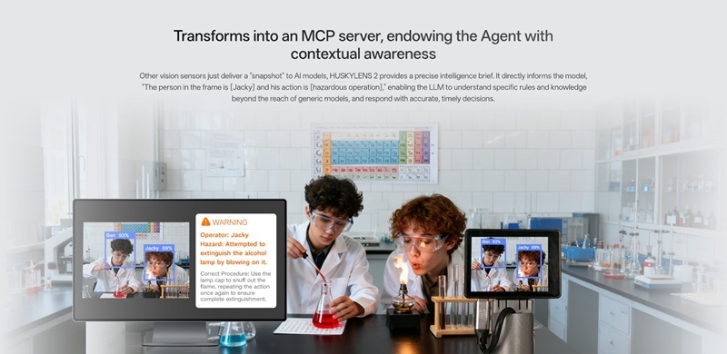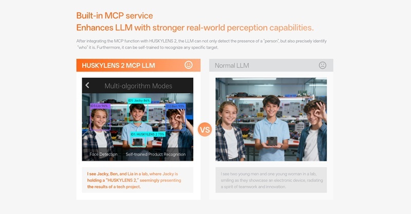 HUSKYLENS2 AI視覺感測器通過內置MCP(Model Context Protocol)服務,為大語言模型提供了直接感知和理解物理世界的能力。突破傳統大模型僅能進行文本推理的局限,實現了視覺感知與認知能力的深度融合。同時還能識別特定物品和行為特徵,真正實現了從"看到什麼"到"知道什麼"的質變,還能通過自訓練識別任何特定目標。