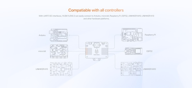 全新升級 HuskyLens 第二代採用6TOPS算力模組,預置20+多種AI模型應用,完美相容Arduino、micro:bit、ESP32、UNIHIKER(M10、K10)、掌控板、Raspberry Pi等主流控制器為智能工業自動化與教育界提供多才多藝視覺解決方案。