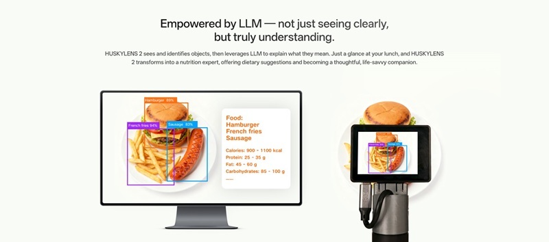 HUSKYLENS2 AI視覺感測器突破傳統識別邊界,深度融合大模型認知能力,不僅能精准識別物體,更能深度理解場景內容並生成專業分析。結合大模型的智慧,不僅能告訴你“這是什麼”,更能告訴你“這意味著什麼”。只需看一眼你的午餐,就能化身營養專家提供膳食建議,成為會思考、懂生活的智慧夥伴。